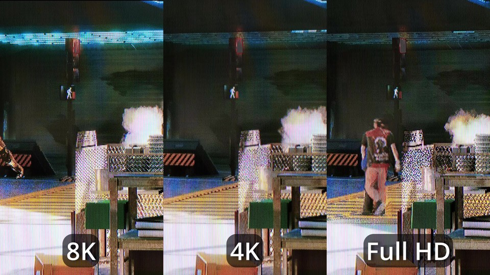 Die folgende kurze Szene zeigt die abgefilmte Nahaufnahme eines Full-HD-Fernsehers mit einer Größe von 46 Zoll, auf dem wir Cyberpunk 2077 in hohen Details ohne Raytracing und DLSS/FRS spielen. Dabei kommen drei verschiedene Auflösungen zum Einsatz: 2K beziehungsweise Full HD (1920x1080), 4K (3840x2160) und 8K (7680x4320). <br /> <br /> Das Video ist Teil dieses Artikels zum Spielen in 8K auf einem Full-HD-Fernseher , in dem ihr auch alles zu den Hintergründen der Aufnahme erfahrt. Wie im Video zu sehen gibt es demnach bei genauem Hinsehen durchaus klar erkennbare optische Vorteile beim Spielen in 8K achtet etwa auf das Gitter in der Mitte und die Lampe im oberen Bildbereich. Sie fallen aber insgesamt und ohne Vergrößerung nur noch so geringfügig ins Gewicht, dass sie den großen Performance-Verlust zumindest unserer Einschätzung nach nicht Wert sind.