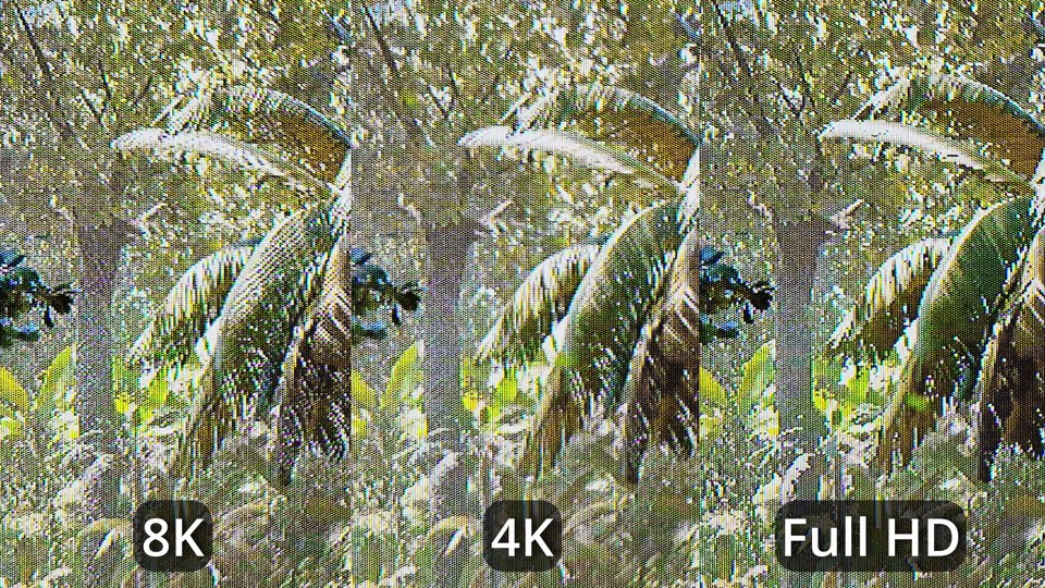 In diesem kurzen Video seht ihr eine aus der Nähe abgefilmte und vergrößerte Szene aus Shadow of the Tomb Raider. Dabei spielen wir in den drei verschiedenen Auflösungen Full HD (1920x1080), 4K (3840x2160) und 8K (7680x4320) auf einem 46-Zoll-Fernseher mit Full-HD-Auflösung. <br /> <br /> Das Video ist Teil dieses Artikels zum Spielen in 8K auf einem Full-HD-Fernseher , in dem ihr auch alles zu den Hintergründen der Aufnahme erfahrt. Sieht man wie in diesem Beispiel genau hin, erkennt man in der Tag gewisse Vorteile bei der Darstellung in 8K, etwa bei den Lianen am Baumstamm oder bei den einzelnen Palmblättern, die sich in 8K klarer voneinander abheben. Der FPS-Verlust fällt aber sehr groß aus, so dass sich das Spielen in 8K zumindest in diesem Fall unserer Einschätzung nach nicht lohnt.