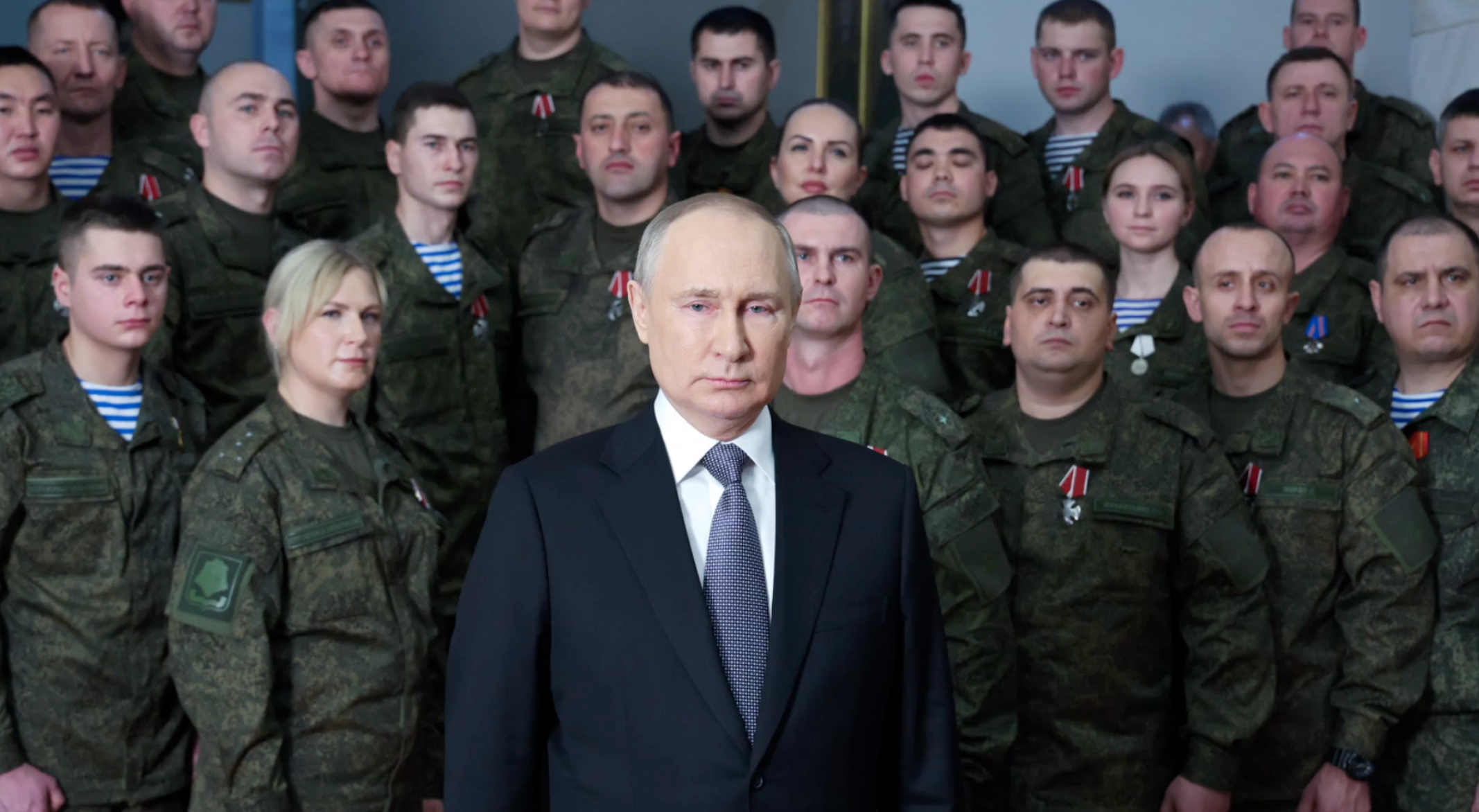 Bei Putins Neujahrsansprache soll er bei der Ehrung der Soldaten für ihre Verdienste nicht mit echten Soldaten aufgetreten sein, sondern mit Schauspielern in Uniformen. Das bezeugen offenbar Bilder und Videos von Regimegegnern auf sozialen Plattformen.