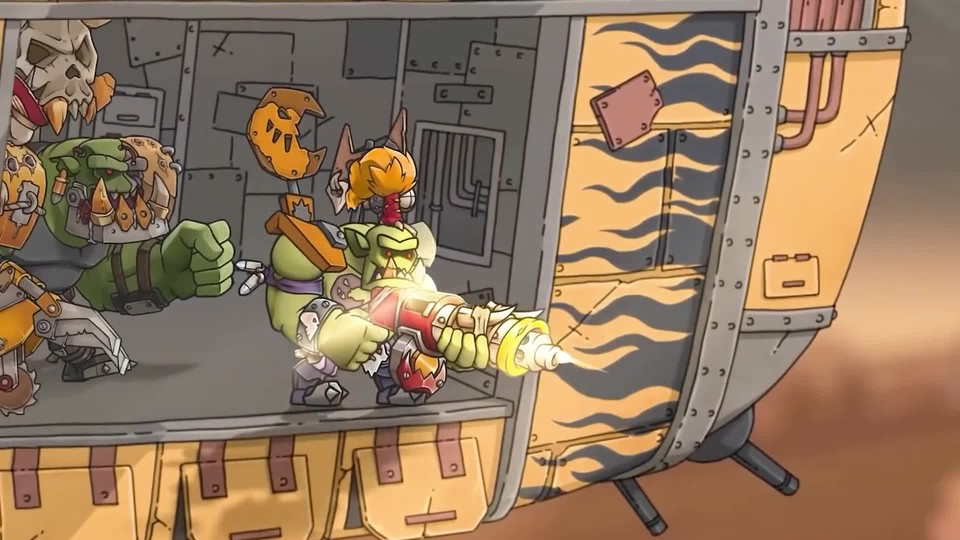 Der Titel verrät es schon: In Warhammer 40,000: Shootas, Blood & Teef stehen die Orks des 40K-Universums im Zentrum. Ihr ballert und metzelt euch nach klassischer Run&Gun-Manier durch Space Marines, andere Orks und mehr. Mit eroberten Ressourcen verstärkt ihr eure Truppe.