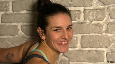 Fitnesstrainerin Aurelia Damann zeigt eine Übung zum Dehnen von Schulter- und Nackenbereich.