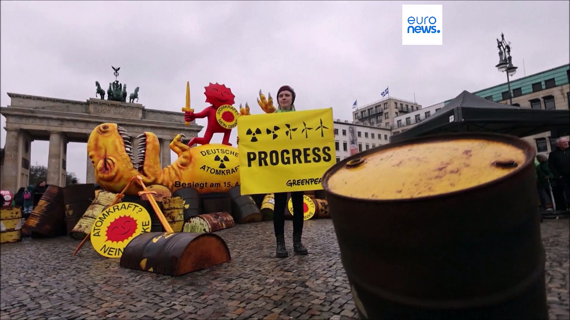 Anlässlich des Endes des Atomzeitalters in Deutschland stellt Greenpeace vor dem Brandenburger Tor in Berlin eine 4 Meter lange Skulptur eines T.rex aus, der auf dem Boden liegt und von Atommüllfässern umgeben ist.