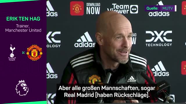Vor dem Spiel gegen Tottenham erklärt Manchester-United-Trainer Erik ten Hag, dass Rückschläge innerhalb einer Saison normal seien und auch Mannschaften wie Real Madrid diese erleiden.