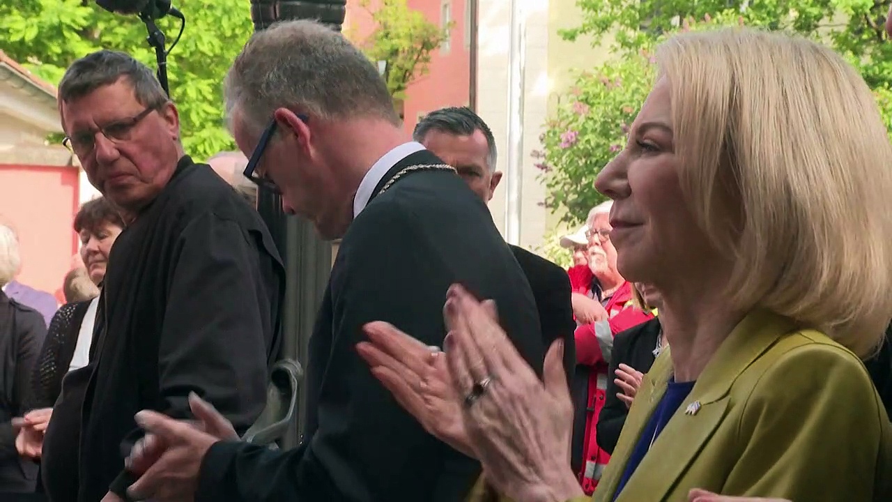 US-Botschafterin Amy Gutmann ist bei der Verlegung von "Stolpersteinen" für ihre jüdische Familie in Feuchtwangen in Bayern dabei. Ihre Vorfahren flohen in den 1930er-Jahren nach Indien und später in die USA.
