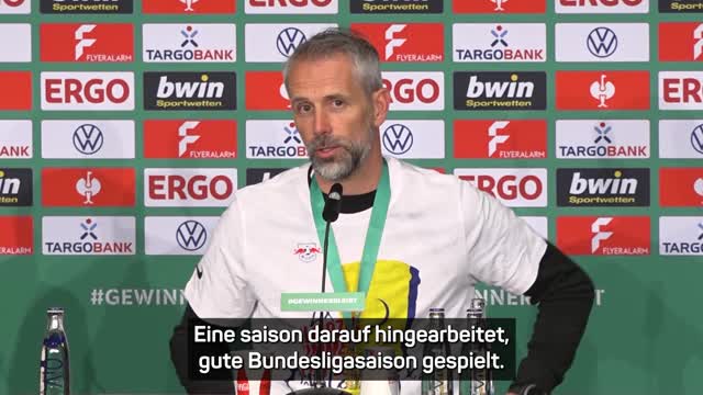 RB Leipzig gewann das DFB-Pokalfinale gegen Frankfurt mit 2:0. Trainer Marco Rose war bereits bei der Pressekonferenz nach dem Spiel tierisch in Feierlaune.