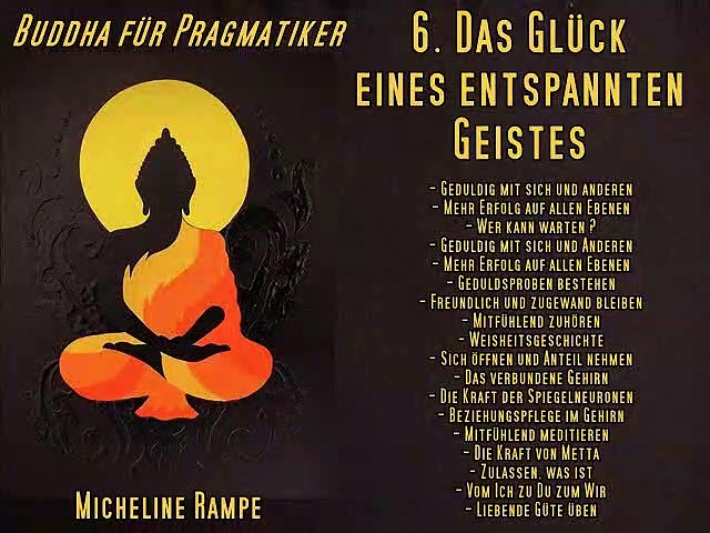 6. Das Glück eines entspannten Geistes:<br />- Geduldig mit sich und anderen<br />- Mehr Erfolg auf allen Ebenen<br />- Wer kann warten ?<br />- Geduldig mit sich und Anderen<br />- Mehr Erfolg auf allen Ebenen<br />- Geduldsproben bestehen<br />- Freundlich und zugewand bleiben<br />- Mitfühlend zuhören<br />- Weisheitsgeschichte<br />- Sich öffnen und Anteil nehmen<br />- Das verbundene Gehirn<br />- Die Kraft der Spiegelneuronen<br />- Beziehungspflege im Gehirn<br />- Mitfühlend meditieren<br />- Die Kraft von Metta<br />- Zulassen, was ist<br />- Vom Ich zu Du zum Wir<br />- Liebende Güte üben<br />"Der Buddhismus kennt sechs essenzielle Tugenden – Großzügigkeit, ethisches Verhalten, Geduld, Ausdauer, geistige Stabilität und Weisheit – und hat zahlreiche Methoden entwickelt, wie wir diese in unserem alltäglichen Leben praktizieren und kultivieren können. Micheline Rampe setzt in der überarbeiteten Neuauflage ihres Buches Buddha für Pragmatiker diese Tugenden und Methoden in Beziehung zu den neuesten Ergebnissen der Hirnforschung, die bestätigen, dass zum Beispiel Meditation und Achtsamkeit unser Gehirn nachhaltig verändern und so mehr Selbstbestimmung, Zufriedenheit und Resilienz in unser Leben bringen. Die Kombination von wissenschaftlicher Forschung, traditioneller Lehre und dazu passenden Übungen machen Rampes Buch zu einem übersichtlichen Begleiter für die Praxis, ganz gleich, ob man Anfänger oder erfahrener Praktizierender ist, und unabhängig davon, ob man einer buddhistischen Tradition angehört oder nicht. Dieser säkulare und wissenschaftlich untermauerte Buddhismus 2.0 wird in Buddha für Pragmatiker überaus klar, verständlich, präzise und lebendig vorgestellt. Die Übungen sind sehr anschaulich und leicht zu erlernen, und jeder kann von ihnen profitierten – vorausgesetzt, man bleibt dran und praktiziert regelmäßig und langfristig."