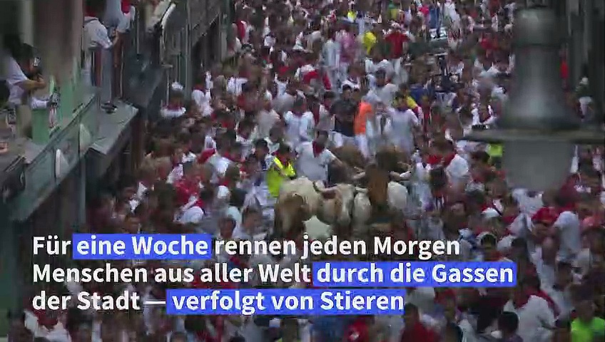 Auftakt zur jährlichen Stierhatz im spanischen Pamplona: Beim San-Fermín-Fest laufen hunderte Schaulustige mit den Tieren durch die engen Gassen. Jedes Jahr kommt es zu zahlreichen Verletzungen bei Menschen wie bei Tieren. Auch deshalb ist die Veranstaltung stark umstritten.