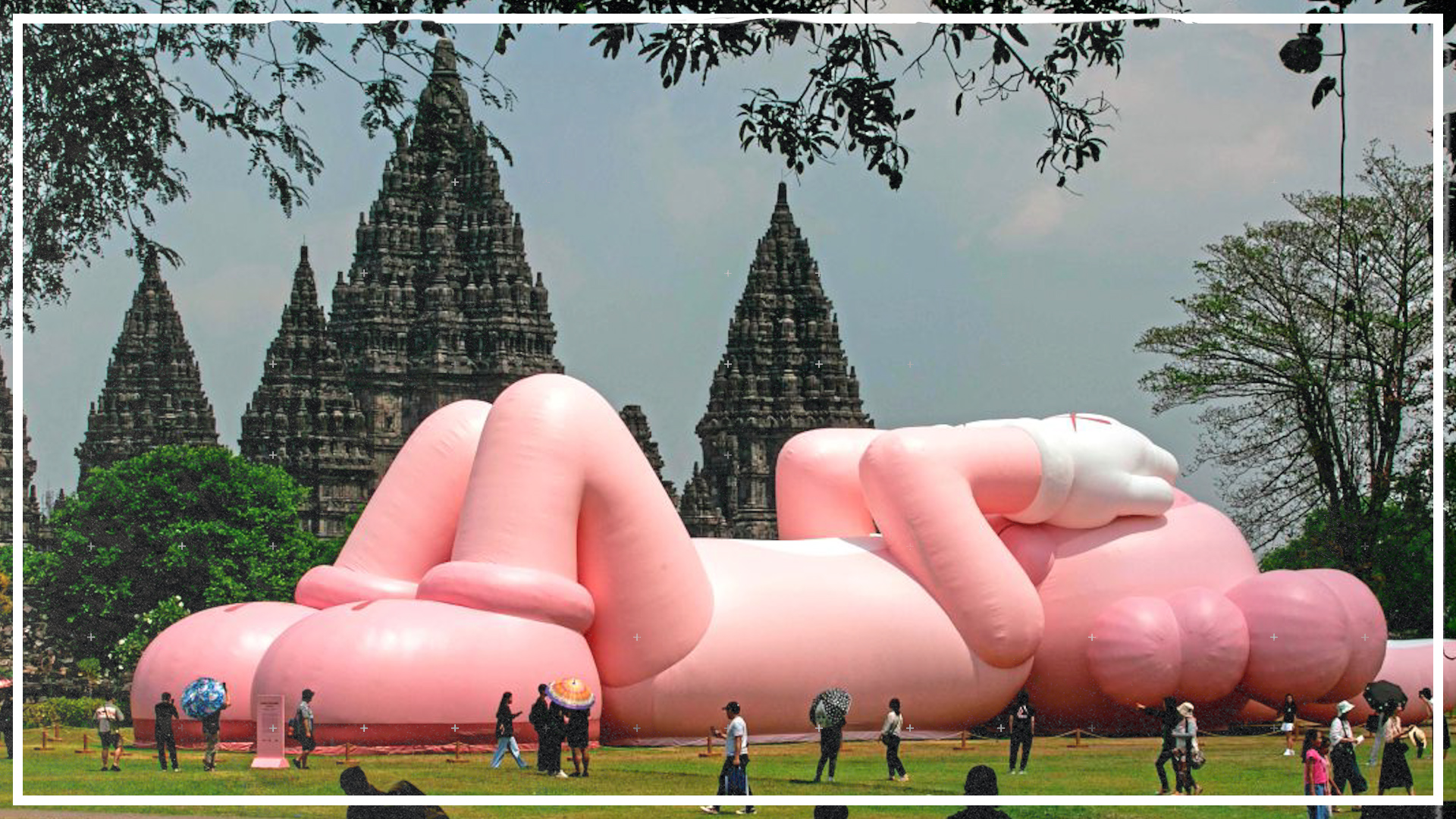 Ein riesiger rosafarbener Hase neben der berühmten Tempelanlage von Prambanan auf der indonesischen Insel Java zieht die Blicke der Besucher auf sich. Bei der aufblasbaren Figur handelt es sich um ein Werk des US-Künstlers Brian Donnelly, auch bekannt als Kaws.