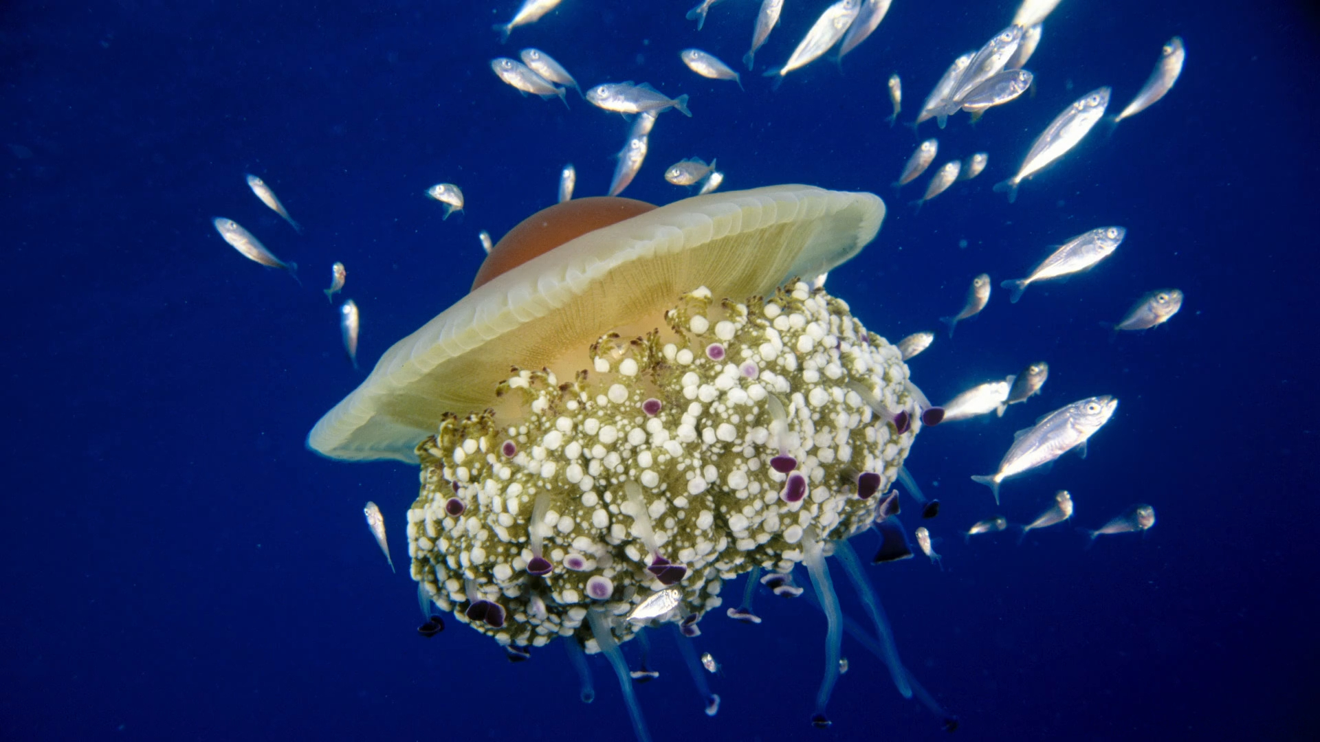 An der Küste Kataloniens sind derzeit tellergroße Spiegeleiquallen in Strandnähe zu finden. Ein Rettungsschwimmer in Sitges südlich von Barcelona berichtet, dass sie an heißen Tagen vermehrt am Strand auftauchen und die Badegäste nervös machen würden.