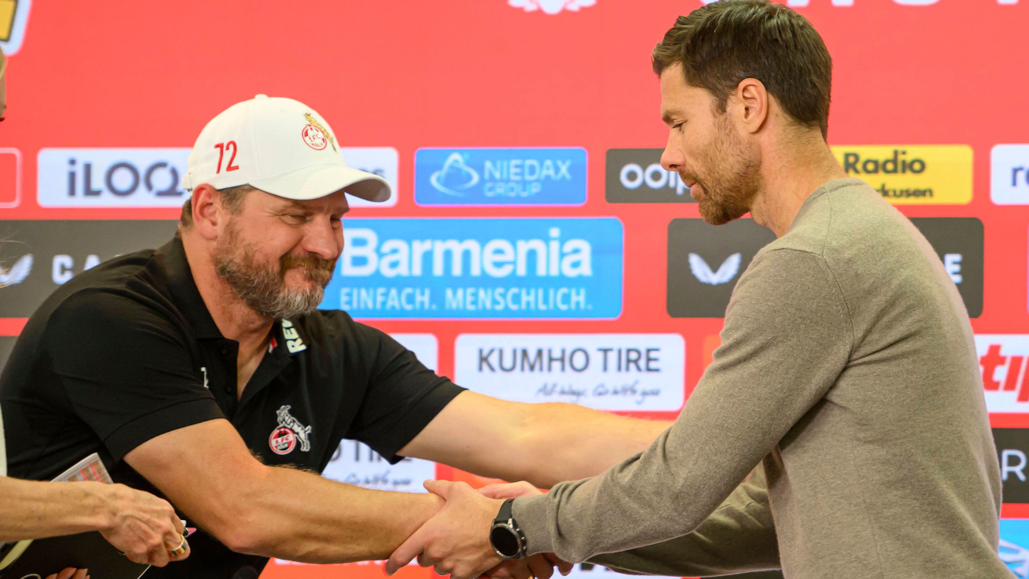 Auf der Pressekonferenz nach dem 0:3 im Derby in Leverkusen unterbricht Steffen Baumgart seinen Kollegen Xabi Alonso, stimmt diesem bei dessen Aussage aber zu.