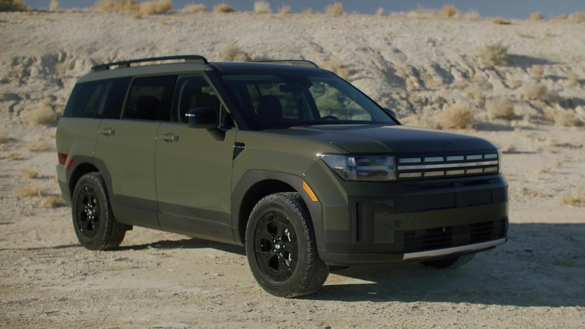 Die mit klaren Linien gezeichnete Form und die markante Silhouette des neuen SANTA FE ergeben sich aus seinem langen Radstand und dem breiten Heckbereich.<br /><br />Durch die hohe Motorhaube, die H-förmigen Scheinwerfer und die kräftigen Kotflügel vermittelt das Fahrzeug einen Eindruck von Erhabenheit. Die H-förmigen Scheinwerfer harmonieren mit dem H-Motiv im unteren Bereich der Frontpartie und sorgen so für ein abgeschlossenes Erscheinungsbild. Die H-förmigen Designelemente interpretieren das "H"-Emblem im Hyundai-Logo neu.<br /><br />In der Seitenansicht bietet der verlängerte Radstand Platz für eine kraftvolle Dachlinie, eine muskulöse Form an den Kotflügeln, stark ausgeprägte Radkästen, einen verkürzten vorderen Überhang und 21-Zoll-Räder, die dem SUV einen robusten abenteuerlichen Look verleihen.<br /><br />Das durch die größere Heckklappe geprägte Heck ist schlichter und balanciert das gesamte Außendesign aus. Die H-förmigen Rückleuchten bilden mit den vorderen H-Lichtern eine harmonische Einheit und verleihen dem SANTA FE bei Tag und Nacht eine unverwechselbares Aussehen.