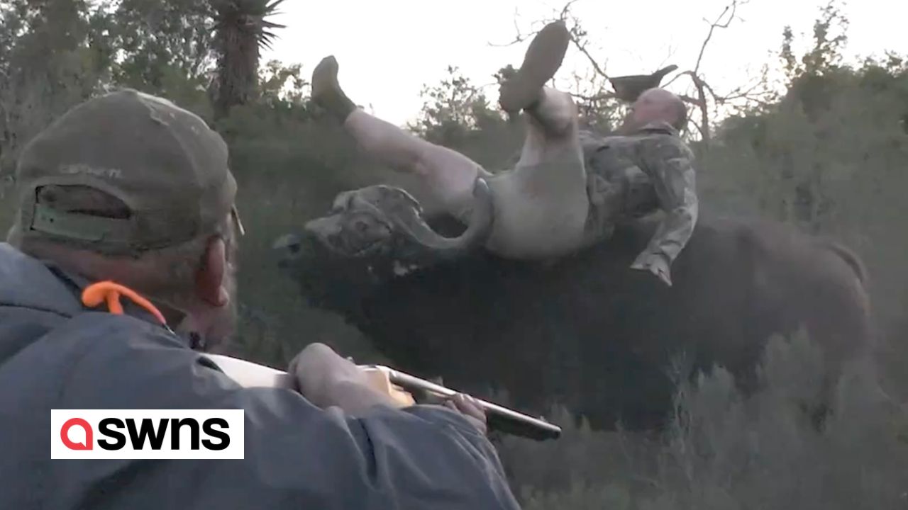Dies ist der schockierende Moment, in dem ein Büffel einen Mann in die Luft schleuderte und sein Bein durchbohrte.<br /><br />Martin Müller, 43, wurde beauftragt, den Jagdausflug zu filmen und hielt den Vorfall mit der Kamera fest.<br /><br />Der verletzte Mann war der Gruppe von Jägern behilflich, als er von dem Tier angegriffen wurde.<br /><br />Martin sagte: „Wir haben ihn ins Krankenhaus geschickt. Er war froh, am Leben zu sein, als er zurückkam."<br /><br />Der Vorfall ereignete sich im Jahr 2021.