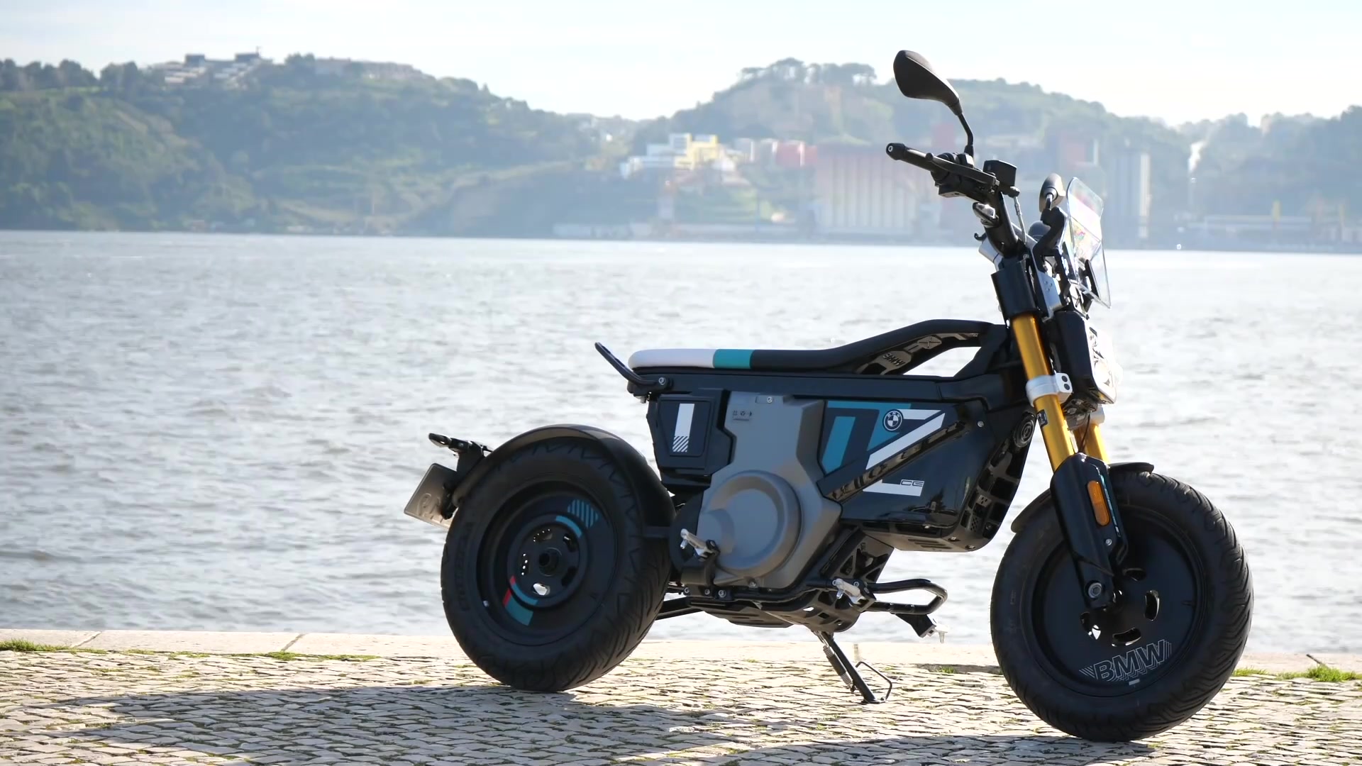 Der neue BMW CE 02 steht für einen neuen Zugang zu BMW Motorrad. Er ist elektrisch, er spricht insbesondere auch Jugendliche an und er ist weder E-Motorrad noch E-Scooter. Er ist eParkourer. Geschaffen für die City und fürs urbane Umfeld. Flink, praktisch, robust und formsprachlich auf das Notwendigste reduziert. Große Räder lösen den Anspruch an Robustheit ein und stehen gleichzeitig für Fahrspaß auf vielen Terrains. Schwarz als Grundfarbe für Rahmen, Räder, Frontfender und Gabelbrückenverkleidung oben sowie Granitgrau metallic matt für die Motorabdeckung bieten einen ebenso spannenden Kontrast wie das Wechselspiel aus matten und hochglänzenden Oberflächen. In der Sonderausstattung HIGHLINE präsentiert sich der neue CE 02 indes extrovertiert und farbenfroh. Eine in Gold eloxierte Gabel und ein Tape-Design in Verbindung mit Petrol als Kontrastfarbe lässt den CE 02 bereits im Stand dynamisch und zukunftsorientiert wirken.