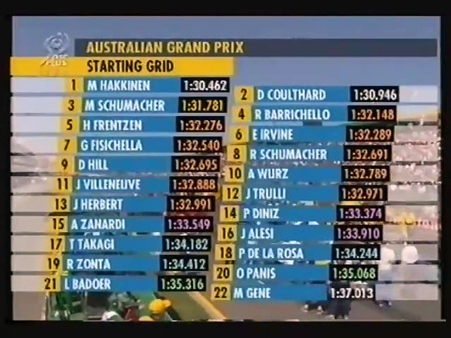 Das Starterfeld der F1 Saison 1999<br /><br />West McLaren Mercedes<br />01 Mika Häkkinen<br />02 David Coulthard<br /><br />Scuderia Ferrari Marlboro<br />03 Michael Schumacher<br />04 Eddie Irvine<br /><br />Winfield Williams<br />05 Alessandro Zanardi<br />06 Ralf Schumacher<br /><br />Benson & Hedges Jordan<br />07 Damon Hill<br />08 Heinz Harald Frentzen<br /><br />Mild Seven Benetton Playlife<br />09 Giancarlo Fisichella<br />10 Alexander Wurz<br /><br />Red Bull Sauber Petronas<br />11 Jean Alesi<br />12 Pedro Diniz<br /><br />Repsol Arrows F1 Team<br />14 Pedro de la Rosa<br />15 Toranosuke Takagi<br /><br />HSBC Stewart Ford<br />16 Rubens Barrichello<br />17 Johnny Herbert<br /><br />Gauloises Prost Peugeot<br />18 Olivier Panis<br />19 Jarno Trulli<br /><br />Fondmetal Minardi Ford<br />20 Luca Badoer<br />21 Marc Gene<br /><br />British American Racing<br />22 Jacques Villeneuve<br />23 Ricardo Zonta<br /><br />Gerne könnt ihr mich mit einer kleinen Spende via Paypal über felixbestoff1@gmx.de unterstützen.<br />Ebenso könnt ihr mich für Fragen und Anregungen über diese E-Mail Adresse erreichen.