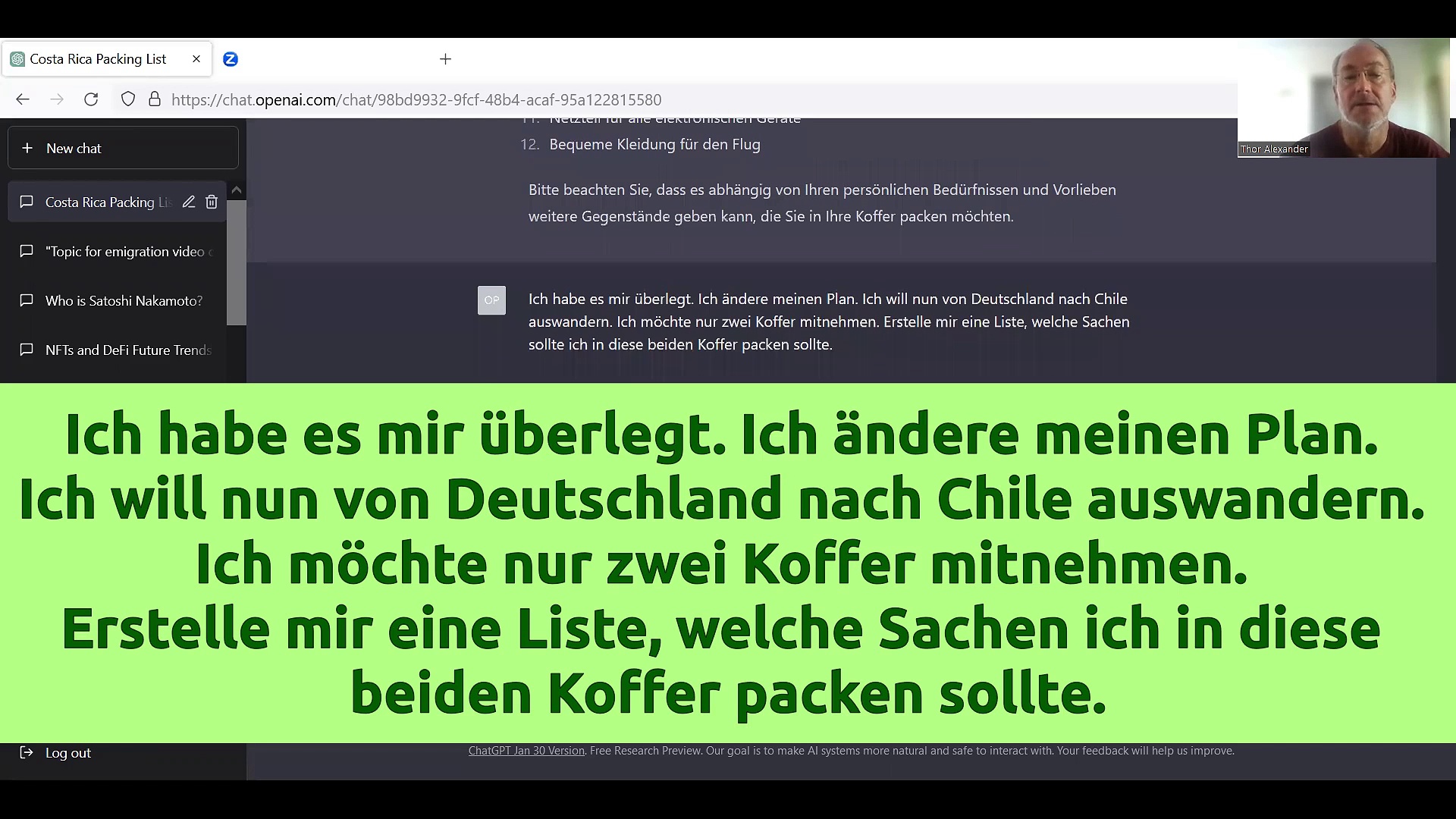 Ich hab es mir überlegt. Ich wandere doch nicht mit zwei Koffern nach Costa Rica aus. Meine neuen Ziele sind #Chile, #Thailand und #Russland. Dazu befragte ich die künstliche Intelligenz, was sie mir rät mitzunehmen. Schau Dir an, was sie meint.<br /><br />Zum Schluss zeigt Mr. Maracuja einige Fotos zwischen Moskau und Wolga.<br /><br />Musik von Ronald Kah (Traveler), Web: https://ronaldkah.de<br />___________________________________________<br /><br />+ PlayListe Auswandern weltweit: <br />https://youtube.com/playlist?list=PLiNUqYCO49mR537xzrfvEaSkzSCpvq9-r<br /><br />___________________________________________<br />AUF TELEGRAM:<br /><br />+ Hast Du FRAGEN?<br />https://t.me/ThorAlexander<br /><br />+ Auswandern nach Chile: <br />https://t.me/Auswandern_Chile<br /><br />+ Auswandern nach Thailand: <br />https://t.me/Auswandern_Thailand<br /><br />+ Auswandern nach Russland: <br />https://t.me/Auswandern_Russland<br /><br />___________________________________________<br />+ Dieser YOUTUBE-Kanal:<br />https://www.youtube.com/@mr_maracuja