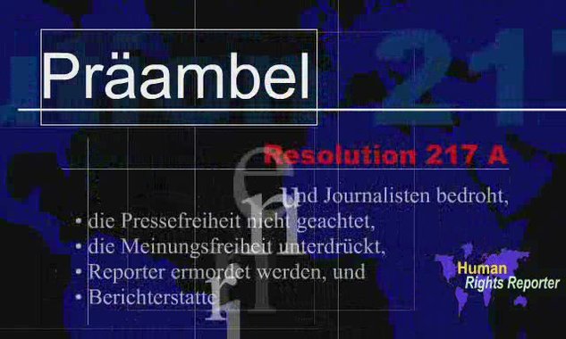 Ein in Flash animiertes und erstelltes Intro für das bald neu im Web erscheinenden Medienprojekt - Menschenrechtsreporter - das ich grad umgewandelt habe in ein Taugliches Video Format.Das Intro wartet auf mit der allgemeinen Menschenrechtserklärung ( Präambel ) Resolution 217 A - und ein wenig Text , Musik und Animation