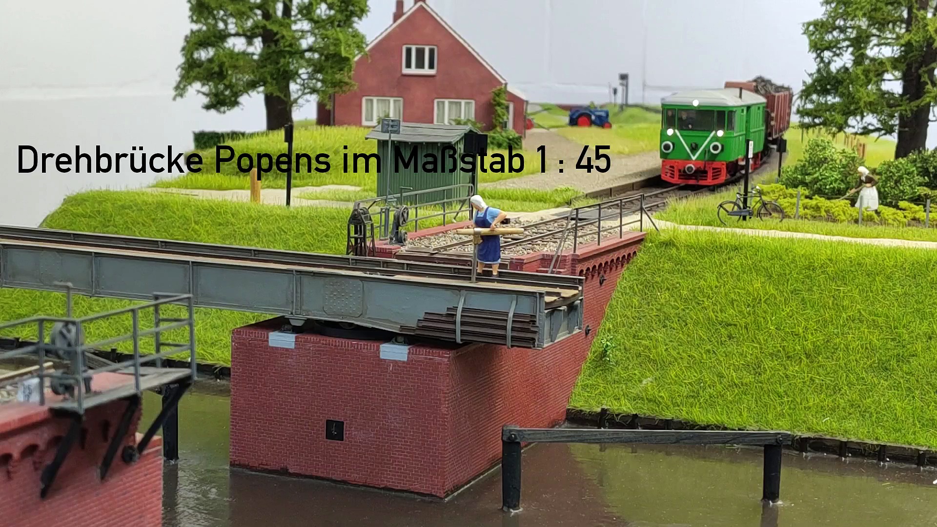Der Öffnungsvorgang der Drehbrücke Popens der Kleinbahn Leer Aurich Wittmund wird an einem Funktionsmodell vorgeführt.