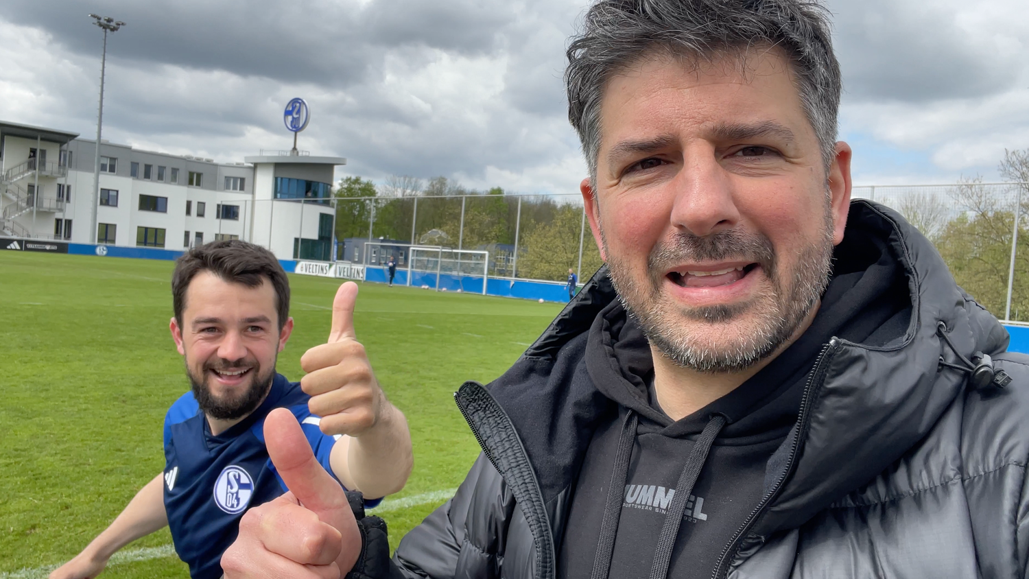 kicker-Reporter Toni Lieto berichtet über die aktuelle Kadersituation beim FC Schalke 04. Amin Younes, welcher zusammen mit anderen Spielern der zweiten Mannschaft auf dem Platz steht, läuft nach einem Lupfer jubelnd vor die Kamera des Reporters.