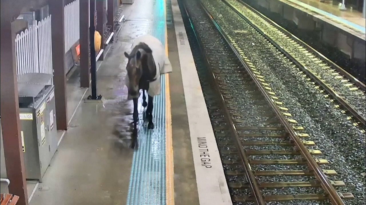 Aufnahmen aus Überwachungskameras zeigen, wie ein ausgebüxtes Reitpferd in der australischen Stadt Sydney durch einen Bahnhof irrt. Den Fahrgästen ist das Tier sichtlich unheimlich.