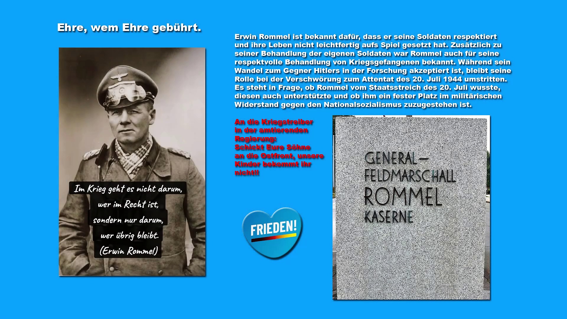 Erwin Rommel ist bekannt dafür, dass er seine Soldaten respektiert <br />und ihre Leben nicht leichtfertig aufs Spiel gesetzt hat. Zusätzlich zu <br />seiner Behandlung der eigenen Soldaten war Rommel auch für seine <br />respektvolle Behandlung von Kriegsgefangenen bekannt. Während sein Wandel zum Gegner Hitlers in der Forschung akzeptiert ist, bleibt seine Rolle bei der Verschwörung zum Attentat des 20. Juli 1944 umstritten. <br />Es steht in Frage, ob Rommel vom Staatsstreich des 20. Juli wusste, <br />diesen auch unterstützte und ob ihm ein fester Platz im militärischen <br />Widerstand gegen den Nationalsozialismus zuzugestehen ist.<br /><br />An die Kriegstreiber<br />in der amtierenden <br />Regierung:<br />Schickt Eure Söhne<br />an die Ostfront, unsere<br />Kinder bekommt ihr <br />nicht!!