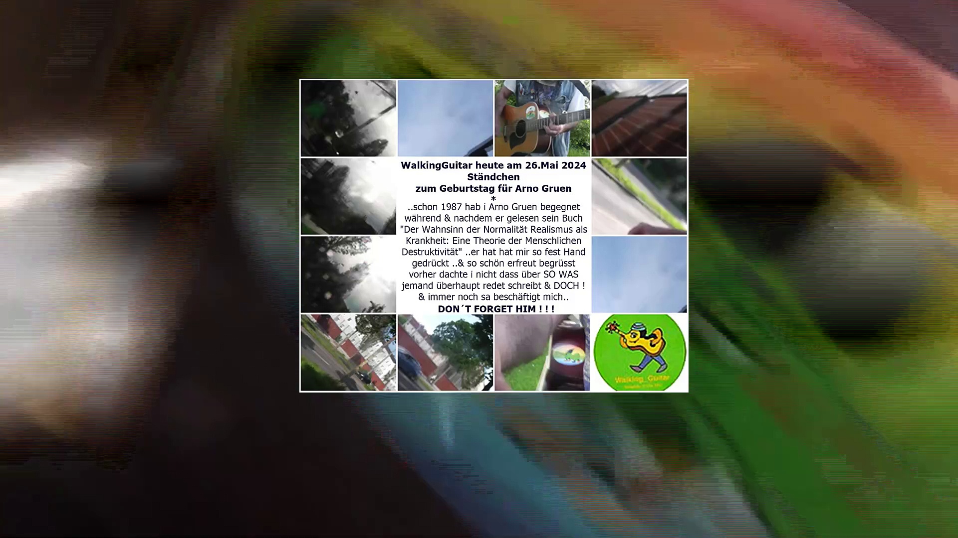 WalkingGuitar heute am 26.05.2024 mit konzert unterwegs live bzw ein Ständchen an Arno Gruen´s Geburtstag ..i kenne Ihn (meinen Freund) & seine Bücher seit 1987 seit i Ihn begegnet hab.. DON´T FORGET HIM ! <br /><br />*Arno Gruen [gʀuːn] (* 26. Mai 1923 in Berlin; † 20. Oktober 2015 in Zürich) war ein deutsch-schweizerischer Schriftsteller, Psychologe und Psychoanalytiker. Nach der Flucht aus Nazideutschland 1936 verbrachte er über 40 Jahre in den USA, wo er studierte und eine akademische Laufbahn einschlug, bis er 1979 nach Europa zurückkehrte und fortan in seiner Wahlheimat Zürich lebte.<br /><br />https://de.wikipedia.org/wiki/Arno_Gruen