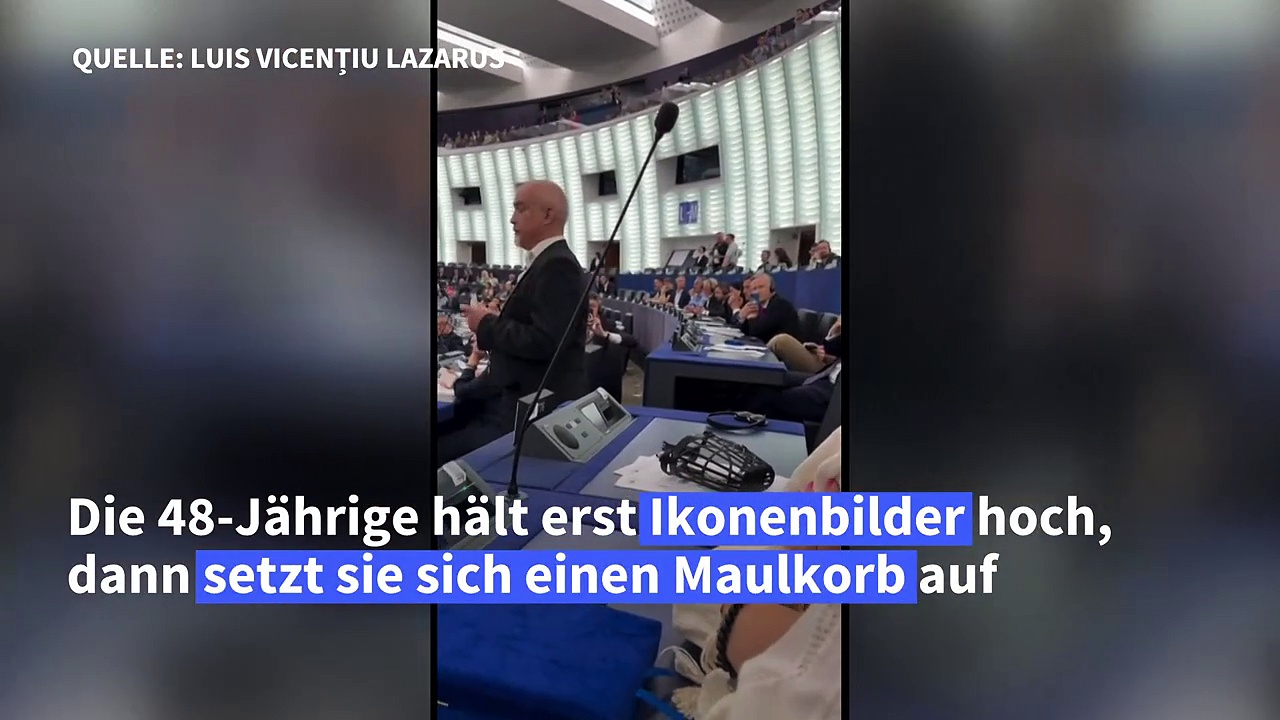 Die neu gewählte rumänische Rechtsaußen-Politikerin Diana Sosoaca hat an ihrem ersten Tag im EU-Parlament einen bizarren Auftritt hingelegt. Erst hielt sie Ikonenbilder hoch und rief "In God we trust", dann setzte sie sich einen Maulkorb auf, als sie aus dem Plenum geführt werden sollte.
