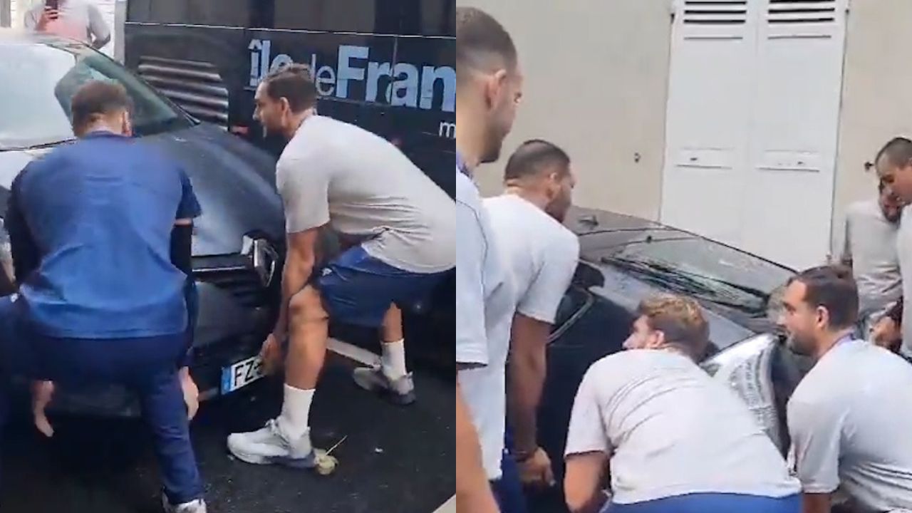 Die griechische Wasserballmannschaft hob ein Auto hoch, damit ihr Bus eine Pariser Straße hinunterfahren konnte.