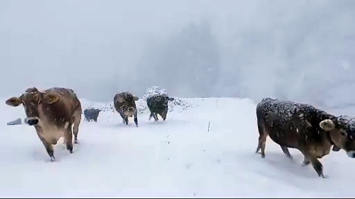 Von der Alpe Bürstegg zwischen Lech und Warth verläuft der Alpabtrieb dieses Jahr mitten durch's Schneegestöber.