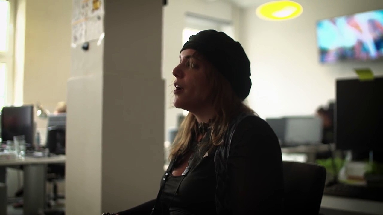 Der Moderator Mike Rofon, die Kamerafrau Tabea Fritsch, der Tonmann Rocco Gördel und die Fuhrparksleiterin Caro arbeite | dHNzX0I1MGd2aGstVC00