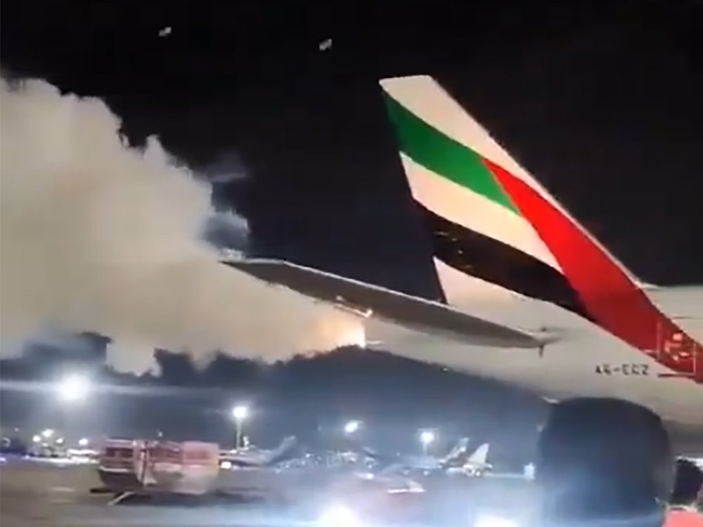 Schock auf dem Flughafen Chennai in Indien: Aus einer Boeing 777 von Emirates schießt kurz vor dem Boarding plötzlich eine Rauchwolke.