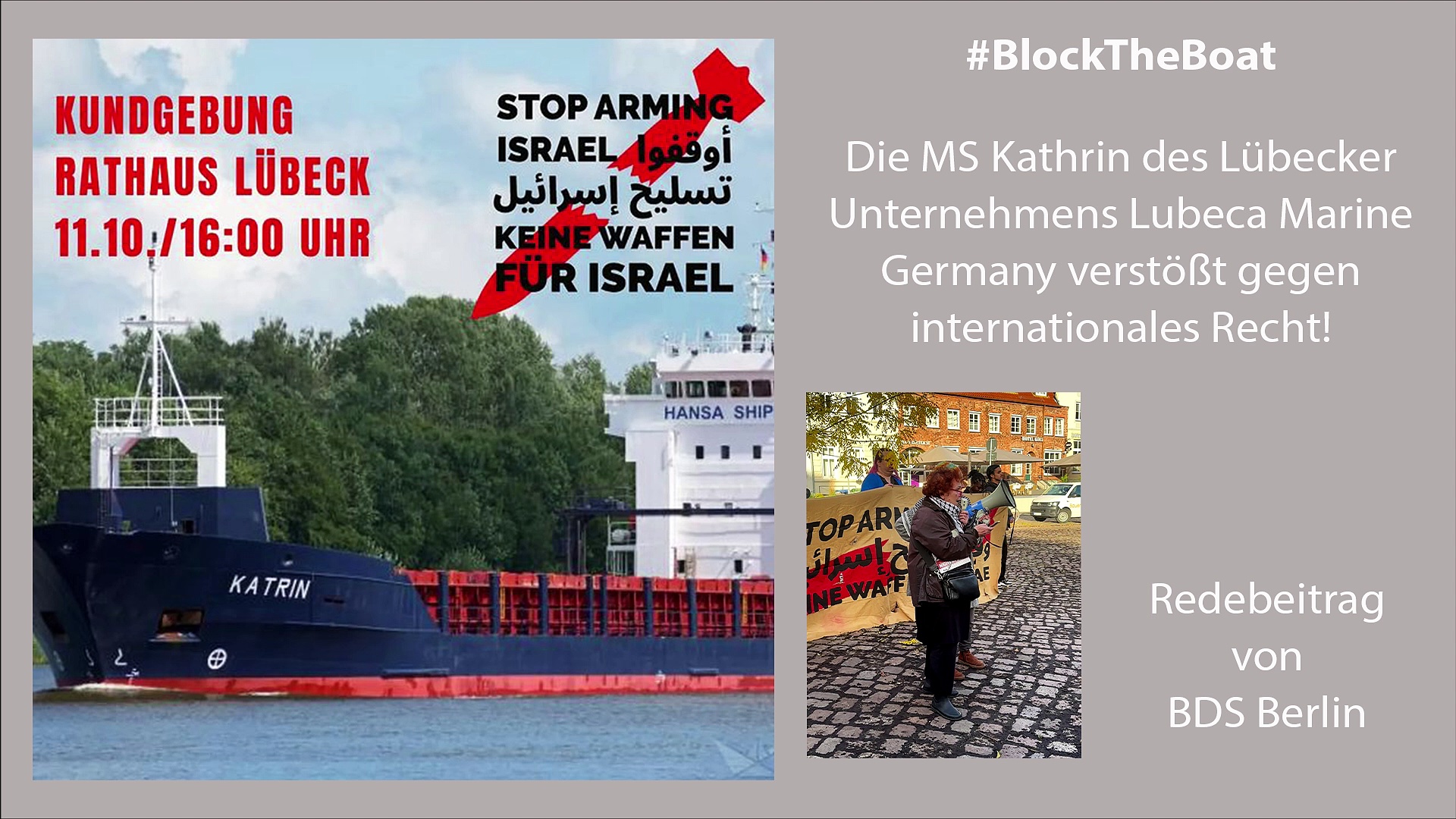 #BlockTheBoat – Die MS Kathrin des Lübecker Unternehmens Lubeca Marine Germany verstößt gegen internationales Recht!<br /><br />Das Lübecker Unternehmen Lubeca Marine Germany ist Eigentümer des Frachters MS Kathrin, der am 31. Juli 2024 den Hafen im vietnamesischen Hai Phong, verließ – beladen mit 8 Containern, die Sprengstoff RDX/Hexogen enthalten – im Auftrag der israelischen Waffenfirma IMI (Israel Weapon Industries). Die Ladung sollte in Koper, Slowenien, gelöscht werden, von wo aus sie an Bord eines anderen Schiffes oder Flugzeugs nach Israel gebracht werden sollte.<br /><br />Nach internationalem Recht sind Verkauf, Kauf und Transit von Waffen nach Israel illegal, besteht doch die Gefahr, dass sie oder Güter mit doppeltem Verwendungszweck im Rahmen des vom IGH von Israels vom IGH für plausibel erachteten Völkermords in Gaza dort eingesetzt werden. Für die Bundesrepublik Deutschland erwächst daraus die Verpflichtung, derlei Tätigkeiten zu unterbinden.<br /><br />Es liegt in der Verantwortung der Bundesregierung als Aufsichtsbehörde, Unternehmen, die in Deutschland registriert sind und dort ihren Hauptsitz haben, für die Einhaltung des internationalen und deutschen Rechts in Rechenschaft zu nehmen. Dazu gehört auch das Unternehmen Lubeca Marine Germany, in dessen Verantwortung es liegt, unverzüglich Maßnahmen zu ergreifen, um sicherzustellen, dass die Fracht nicht weiter an Bord ihres Schiffes transportiert wird.<br /><br />Aber nichts passiert – Die zutiefst mitschuldige deutsche Regierung, die den illegalen Transport von militärischem Sprengstoff an Bord der Kathrin gestattet hatte und so Israels für plausibel erachteten Völkermord an 2,3 Millionen Palästinenser*innen im Gazastreifen ermöglicht, taucht ab!<br /><br />Nicht so zivilgesellschaftliche Organisationen (u.a. in Malaysia, Angola, Namibia, Portugal, Frankreich, Slowenien, Montenegro, Albanien, Niederlande, Deutschland), die nicht locker ließen und unter der Parole #BlockTheBoat dafür gesorgt haben und dies auch weiterhin tun, dass die MS Kathrin festsitzt, seit nunmehr fast 2 Monaten, und ihre tödliche Ladung nicht los wird, dafür eine Menge Verluste einfährt!<br /><br />#Kein Profit aus Genozid!<br />#BlockTheBoat<br />#Free Palestine<br /><br />Lübeck for Palestine hat die Parole #BlockTheBoat aufgegriffen und, unterstützt von der bundesweiten Kampagne #StopArmingIsrael Germany – ein Bündnis verschiedener Palästina-solidarischer Gruppen – zu einem Protestmarsch durch die Lübecker Innenstadt aufgerufen!<br /><br />Die ursprünglich angedachte Route bis zum Sitz des Unternehmens Lubeca Marine Germany wurde von der Polizei nicht genehmigt, die Straße dorthin war auch prompt abgeriegelt. Mit zahlreichen Redebeiträgen vom nahegelegenen Koberg aus konnten sich die Protestierenden dennoch Gehör verschaffen.<br /><br />http://bdsberlin.org/blocktheboat-die-ms-kathrin-des-luebecker-unternehmens-lubeca-marine-germany-verstoesst-gegen-internationales-recht/