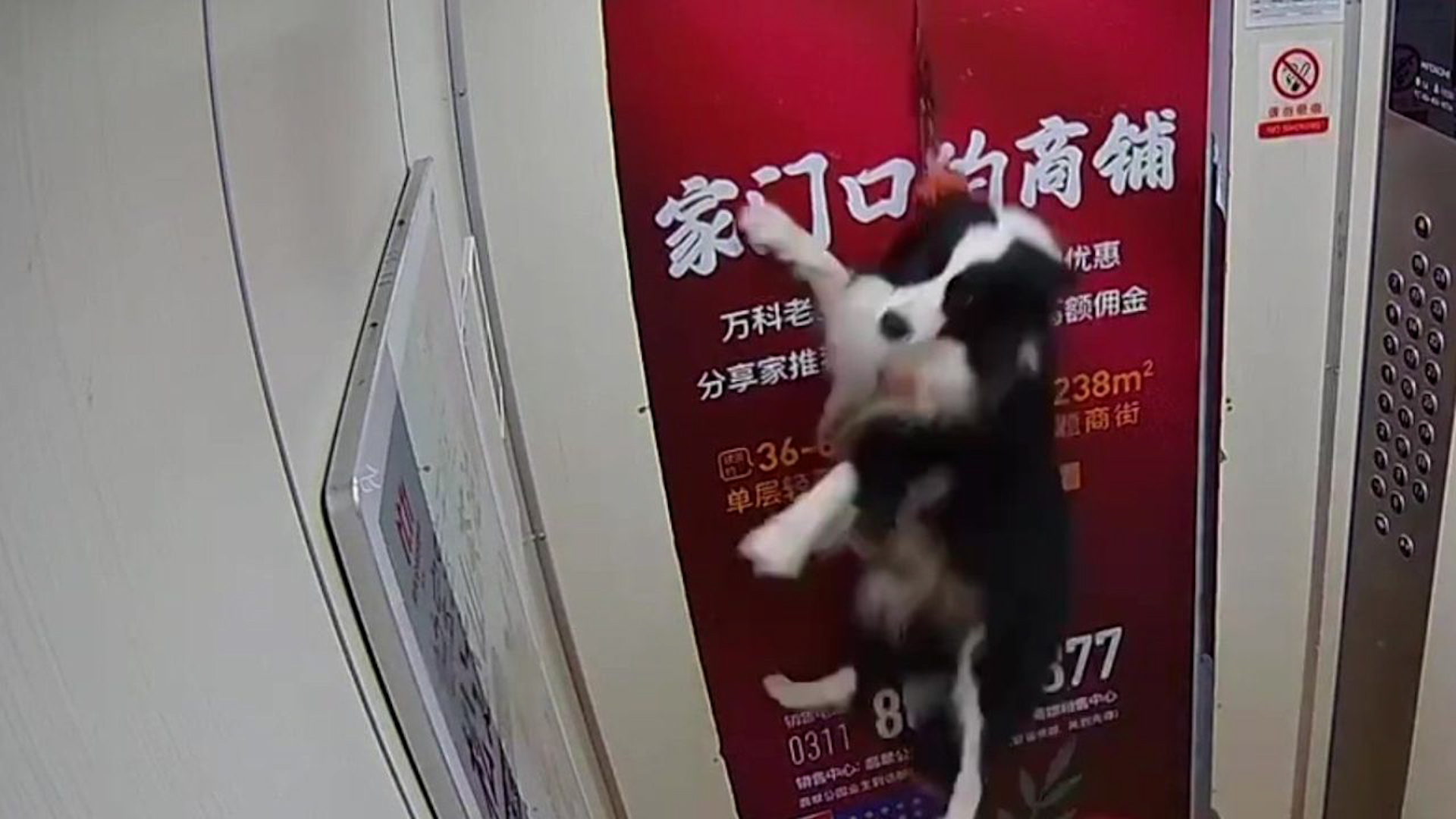 Dies ist der entsetzliche Moment, in dem ein Hund an der Leine im Lift gefangen wurde.<br /><br />Der Besitzer des Hundes, der nicht genannt wurde, schaute weg, als sein Hund - ein Border Collie - in den Lift einstieg, auf den sie in Shijiazhuang, China warteten (14. Oktober). <br /><br />Aber in einem Glücksfall gab das Geschirr nach, wodurch der Hund auf den Liftboden fiel - dem Tod knapp entkam.