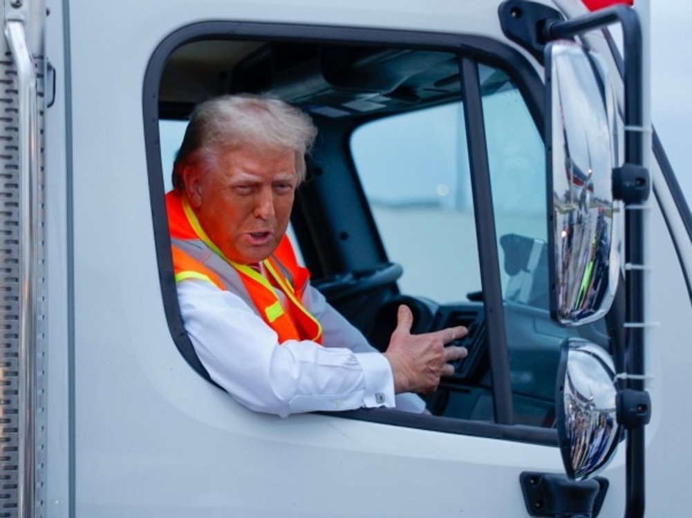 Für einen Wahlkampfauftritt in Wisconsin warf sich Donald Trump in eine orangefarbene Weste und stieg in einen Müllwagen. Damit reagierte er auf Äußerungen von Joe Biden.