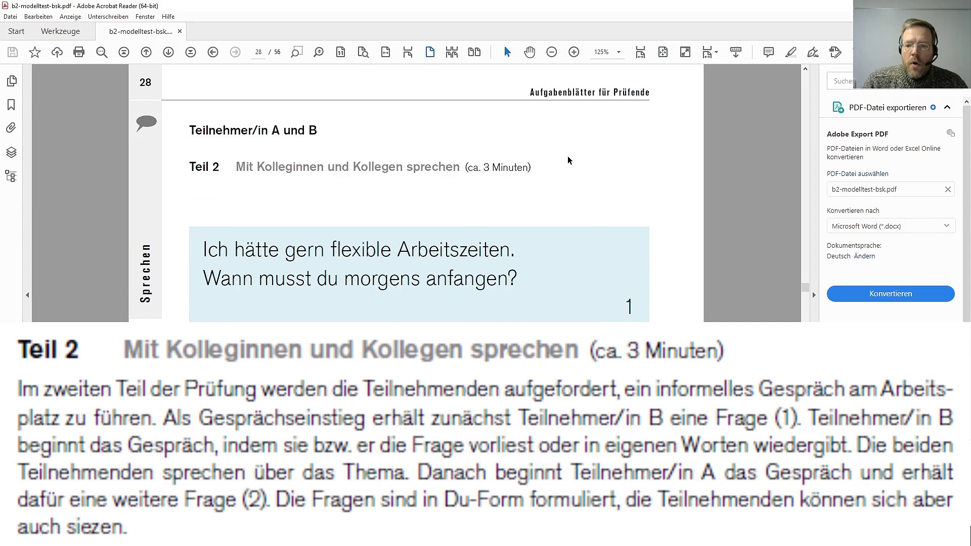 Hallo und herzlich willkommen bei „Lernen mit Uwe“,<br />bereitet ihr euch auf den Deutsch-Test für den Beruf B2 vor? Dann seid ihr hier richtig.<br />Zunächst erkläre ich euch alles, was ihr für diesen Prüfungsteil wissen müsst. Anschließend schauen wir uns die Aufgaben im Modelltest an und ich gebe euch zu beiden Themen Hinweise. Danach spiele ich euch ein exemplarisches Prüfungsgespräch zu jedem Thema vor. Und abschließend bekommt ihr noch ein Tipps zur Vorbereitung auf diesen Prüfungsteil.<br /><br />Hinweis:<br />Den in dieser Videoreihe benutzten Modelltest findet ihr entweder, indem ihr „BAMF Modelltest BSK B2“ googelt. Oder ihr nehmt den folgenden Link, unter dem ihr auch die Audiodatei für die Hörübungen finden und herunterladen könnt:<br />https://www.bamf.de/SharedDocs/Anlagen/DE/Integration/Berufsbezsprachf-ESF-BAMF/BSK-Konzepte/b2-modelltest-bsk.html?nn=282388<br /><br />Die Ausarbeitung könnt ihr hier nachlesen:<br />https://steadyhq.com/lernen-mit-uwe/posts/8d681c66-5b83-4bef-bb5b-5f3344ab3410?utm_campaign=steady_sharing_button<br />Oder hier bekommen:<br />Als Word-Dokument: https://eduki.com/de/1324070<br />Als PDF-Datei: https://eduki.com/de/1324072<br /><br />Möchtet ihr noch mehr üben und euch noch besser auf den DTB B2 vorbereiten? Dann habe ich hier ein paar Vorschläge, mit denen ich in meinen Kursen gute Erfahrungen gemacht habe:<br />https://amzn.to/48SiTgh <br />Oder hier habt ihr eine Auswahl von Büchern zum Prüfungstraining für den DTB B2<br />https://amzn.to/40g0gkj<br />Wenn ihr euch Bücher über diese Affiliate Links kauft, erhalte ich eine Provision und ihr könnt mich so unterstützen. Für euch ändert sich der Preis nicht.<br /><br />Gefallen dir meine Videos? Und möchtest du dein Deutsch weiter mit mir verbessern? Dann hilf mir, "Lernen mit Uwe" noch besser zu machen, werde Mitglied und erhalte zusätzliches Material auf: https://steadyhq.com/lernen-mit-uwe<br /><br />Für meine Videos nutze ich diese Ausrüstung:<br />Kamera: https://amzn.to/3YC7E8r<br />Richtmikro: https://amzn.to/4hfNUib<br />Funkmikro: https://amzn.to/3BUATKF<br />Wenn ihr euch etwas über diese Affiliate Links kauft, erhalte ich eine Provision und ihr könnt mich so unterstützen. Für euch ändert sich der Preis nicht.<br /><br />Hinweis: Die Bilder in meinen Videos gezeigten Bilder sind entweder selbst gemalt, selbst fotografiert oder ich habe sie auf www.pexels.com bzw. www.pixabay.com gefunden.