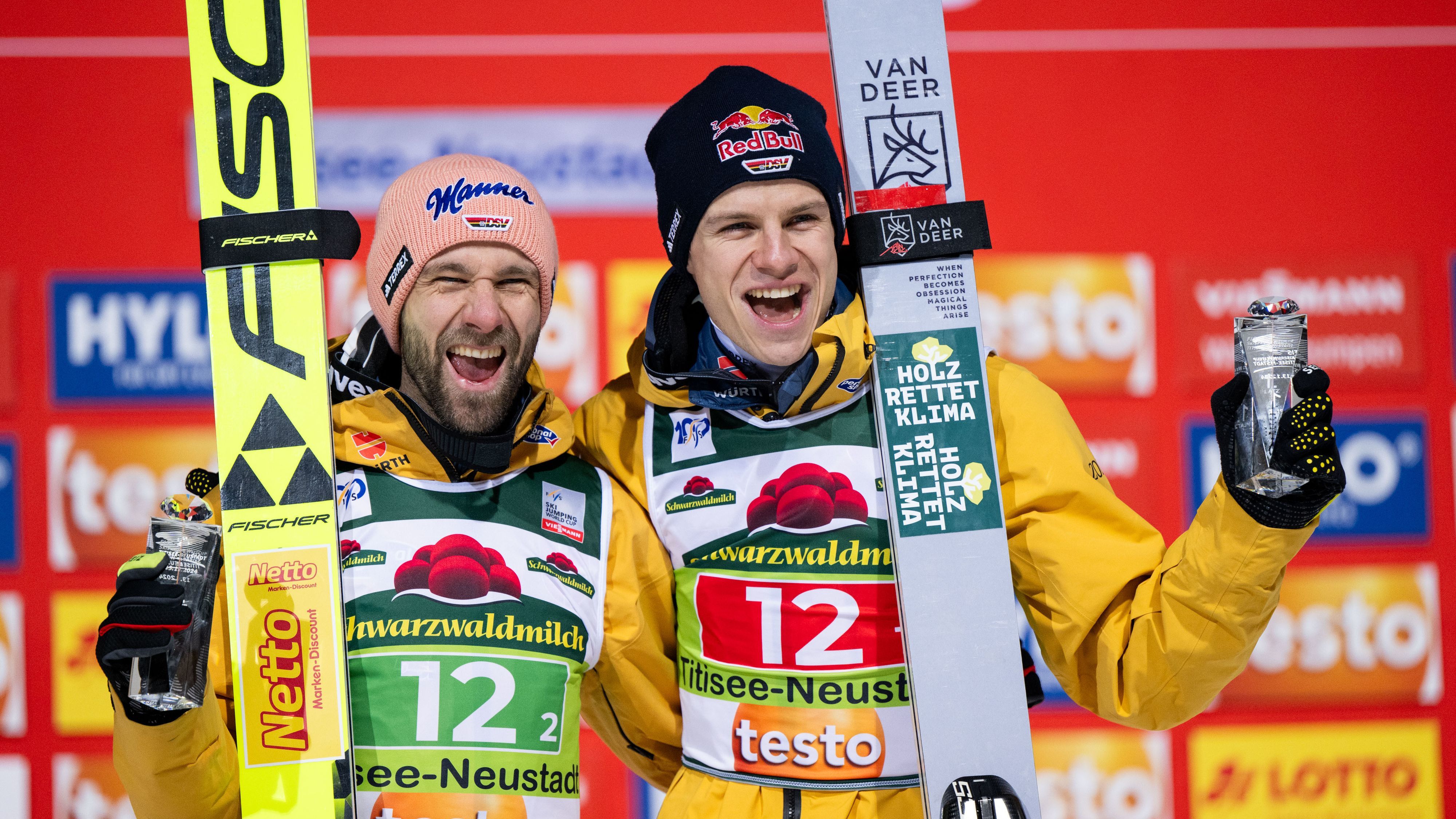 Vor dem Start der Vierschanzentournee saßen die deutschen Hoffnungen Andreas Wellinger und Pius Paschke sowie Bundestrainer Stefan Gornacher auf dem Podium.
