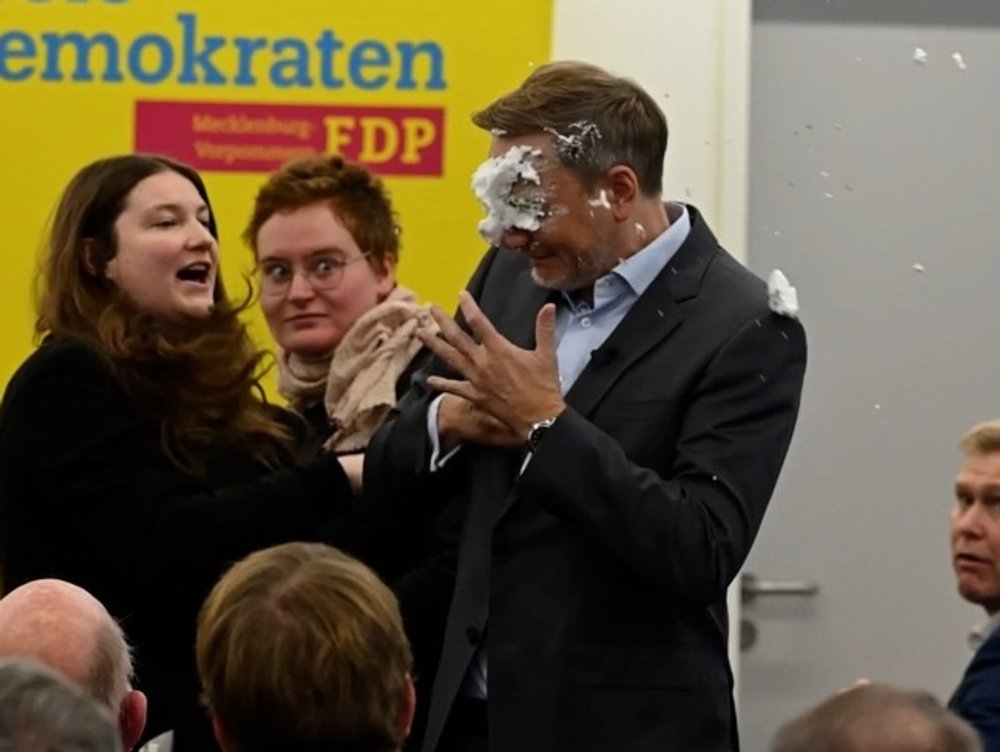 Ein ungewöhnlicher Start in den Wahlkampf: FDP-Chef Christian Lindner wurde am Donnerstag auf der Bühne mit einer Schaumtorte attackiert, die ihn mitten ins Gesicht traf.