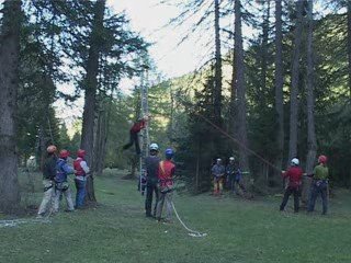 4 Teams mit jeweils mind. 2 Leuten stellen die Leiter auf und halten sie in Balance. Eine Person im Team kann dabei das Leiterseil mit HMS sichern um die Hände zu <br />entlasten. Der Teilnehmer wird in die Schwebesicherung einghängt und frägt die Leiterteams <br />und die Sicherungsteams nach einem „ok“ ab und beginnt den Aufstieg auf die <br />Leiter. Oben angekommen springt er leicht nach vorne weg und wird abgelassen.