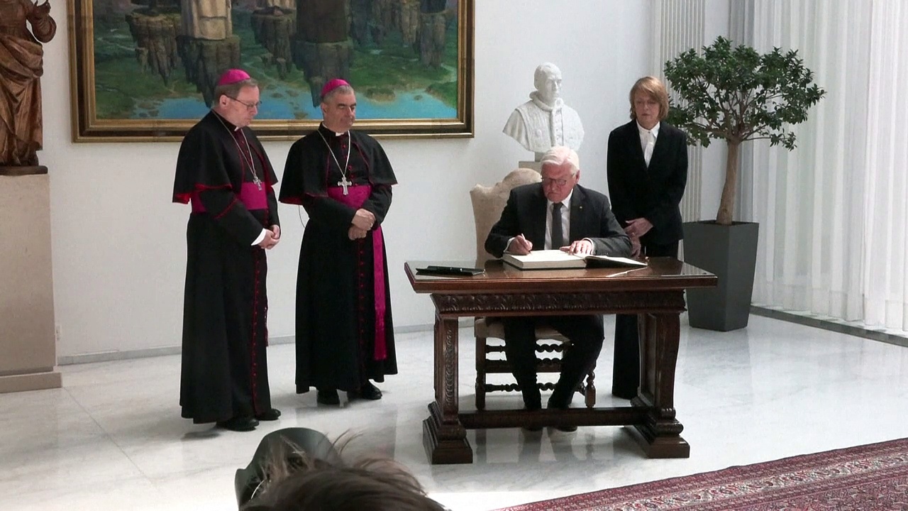 In der Berliner Vertretung des Vatikans liegt ein Kondolenzbuch aus, in das Trauernde sich eintragen können. Als einer der ersten trug sich Bundespräsident Frank-Walter Steinmeier ein.