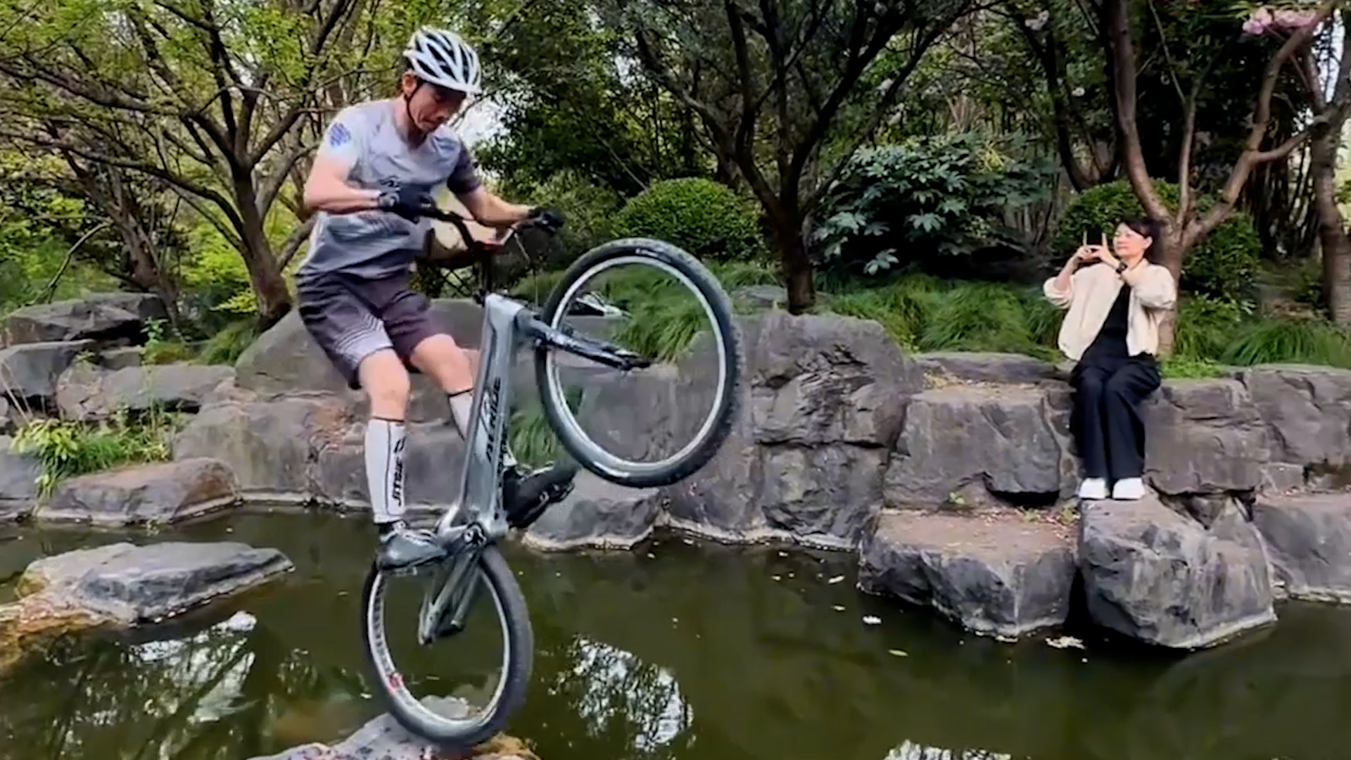 Ein waghalsiger Radfahrer sprang nur mit dem Hinterrad seines Mountainbikes über Flusssteine.