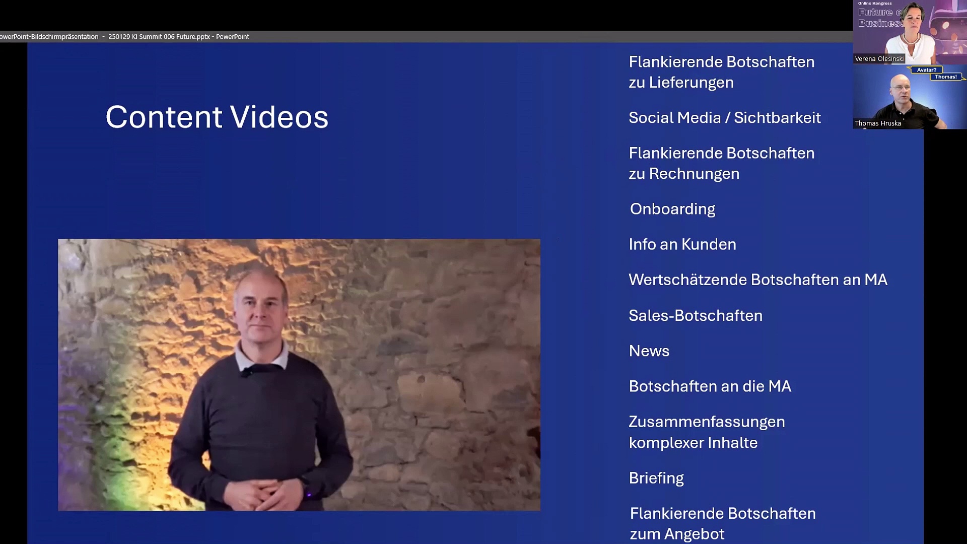 Thomas Hruska zählt zu den führenden Experten für KI-<br />gestützte Avatare und digitale Videokommunikation. Als<br />zertifizierter KI-Trainer unterstützt er Unternehmer,<br />Führungskräfte und Selbstständige dabei, ihre digitale<br />Präsenz effizient zu gestalten – ohne selbst vor der<br />Kamera zu stehen. Mit seiner innovativen Avatar-<br />Technologie lassen sich in Minuten hochwertige<br />Videoinhalte erstellen, die authentisch wirken und gezielt<br />die gewünschte Zielgruppe erreichen. Durch seine<br />langjährige Erfahrung in leitenden Funktionen, im<br />Projektmanagement und in der Prozessoptimierung<br />kennt er die Herausforderungen vieler KMU: Zeitmangel,<br />technische Hürden und hohe Produktionskosten. Seine<br />Lösungen reduzieren Aufwand, sparen Ressourcen und ermöglichen skalierbare Kommunikation.<br />Seitdem hochwertige Tools für KI-gestützte Avatare verfügbar sind, beschäftigt er sich<br />ausschließlich mit deren Weiterentwicklung und Anwendung. Als Speaker und Trainer vermittelt er<br />praxiserprobte Strategien, die sofort umsetzbar sind. Seine Kunden schätzen seine Fähigkeit,<br />komplexe Technologien klar und verständlich zu machen – mit Fokus auf Effizienz, Professionalität<br />und maximalen Impact.<br /><br />https://calendly.com/thomas-hruska/erstgesprach-ki<br />https://calendly.com/thomas-hruska/erstgesprach-ki<br />http://www.hruska.ai/<br />
