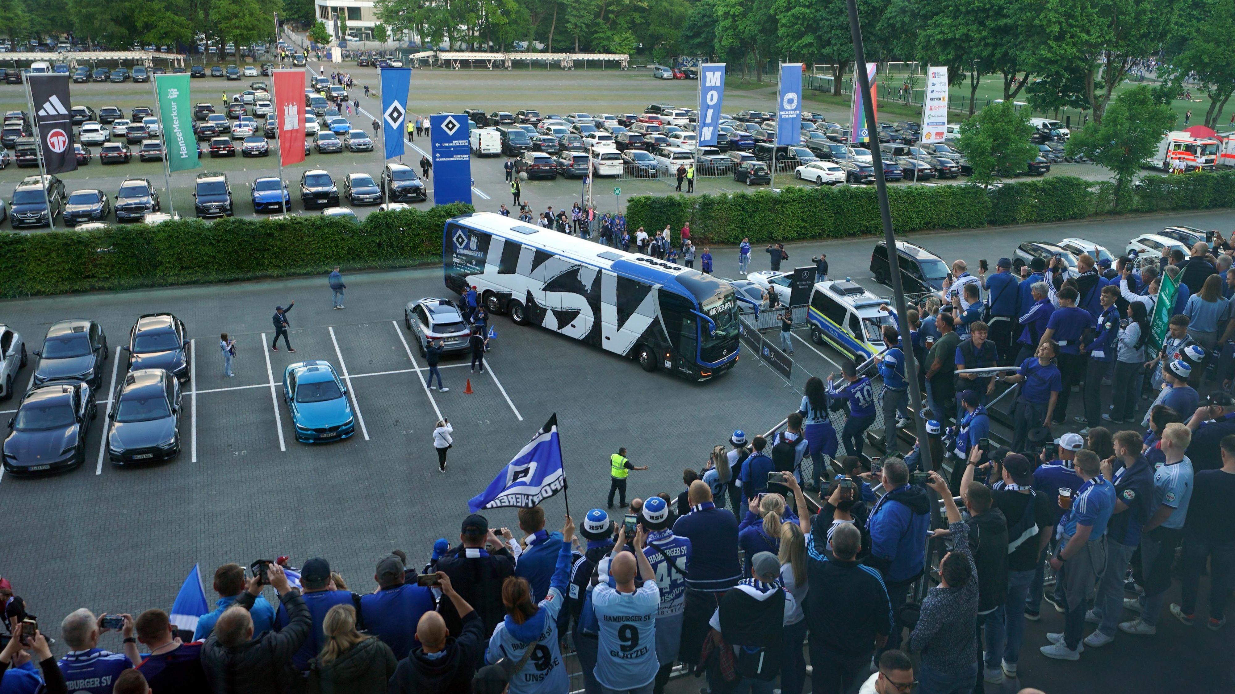 Die HSV-Fans sprachen der Mannschaft vor dem Stadion nochmals Mut zu und begrüßten den Bus mit großem Jubel. Der Countdown im Volkspark hat begonnen.