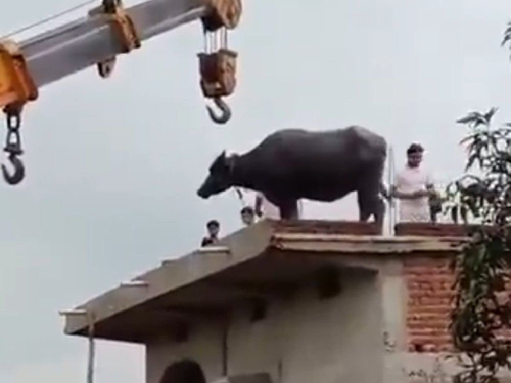 Plötzlich stand ein Büffel auf dem Dach: In einem indischen Dorf kam deswegen ein Kran zum Einsatz.
