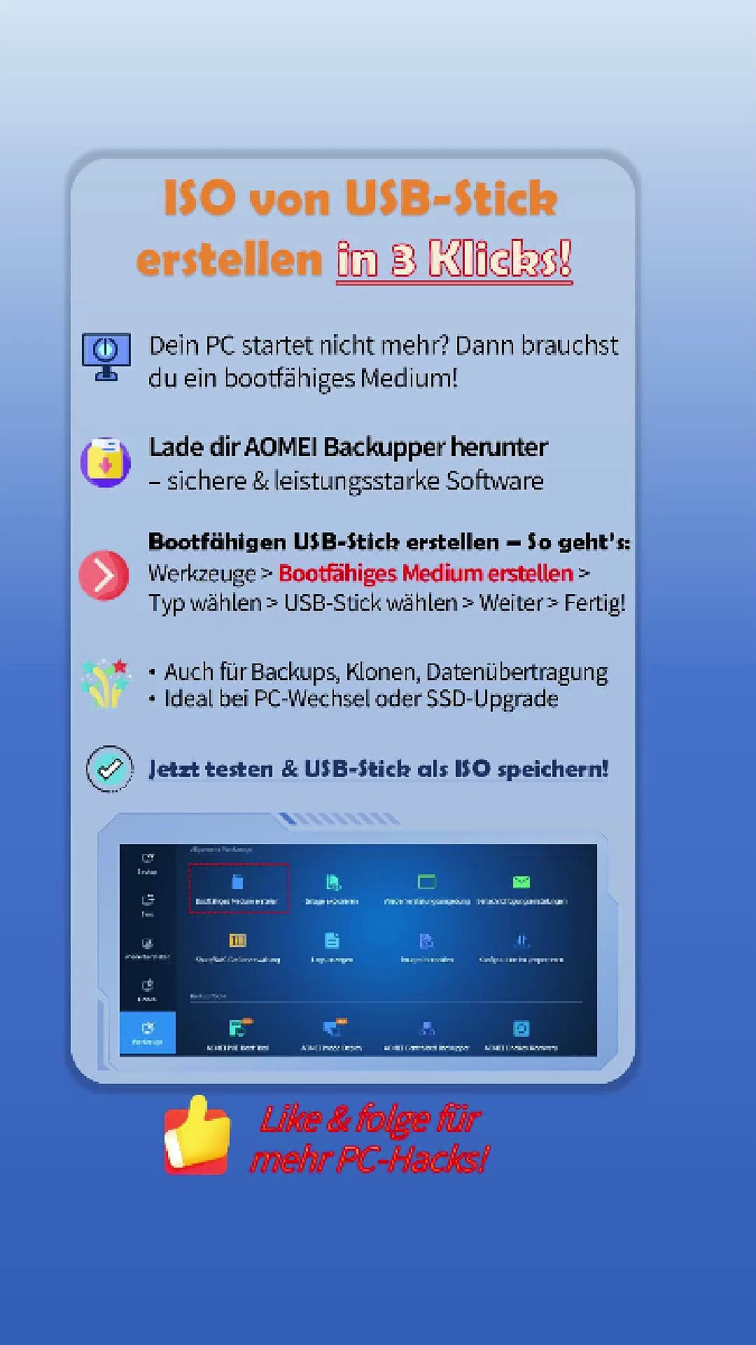 ISO von USB-Stick erstellen in nur drei Klicks!<br />Wenn dein PC nicht mehr startet, brauchst du einen bootfähigen Stick – und genau hier hilft dir AOMEI Backupper.<br />Erstelle ganz einfach ein Boot-Medium und sichere dein System oder stelle Backups wieder her.<br />Mehr als ISO: AOMEI hilft dir auch beim Klonen und Übertragen deiner Daten!<br /><br />👉 Schon ausprobiert? Kommentier jetzt & folge uns für mehr PC-Tipps!<br />#iso von usb stick erstellen #bootfähiger usb stick #usb iso tool #pc hilfe, #system wiederherstellen #daten übertragen #windows tool #iso datei erstellen #tech tipps