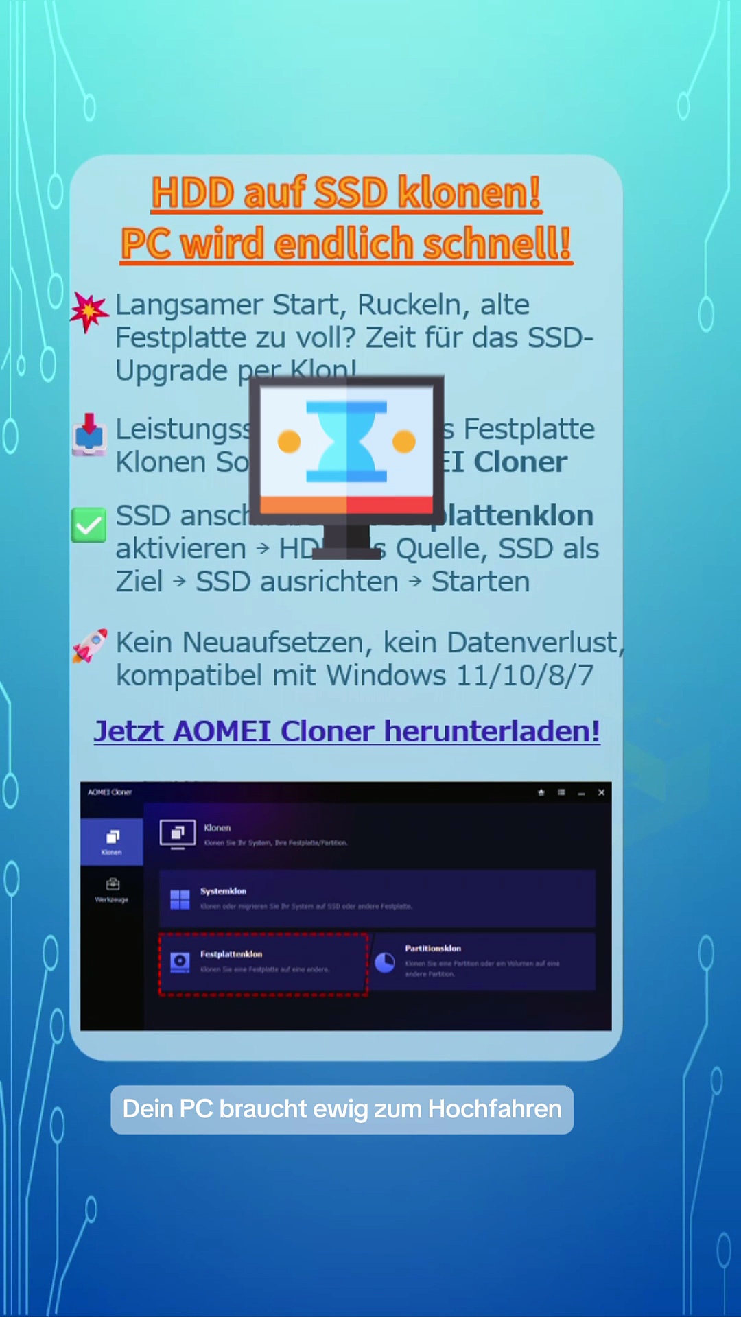 🐢 Dein PC ist langsam, braucht ewig zum Starten und Programme ruckeln?<br />Dann klon deine HDD auf eine SSD – für einen blitzschnellen Windows-Start!<br />Mit AOMEI Cloner geht das ganz einfach:<br />✅ SSD anschließen<br />✅ Festplattenklon genießen<br />✅ 1:1-Kopie deiner Festplatte – ohne Neuinstallation<br />✅ Optimiert für Windows 11, 10, 8, 7<br />✅ Perfekt auch für kleinere SSDs dank intelligenter Klonfunktion<br />💡 Ideal bei System-Upgrades, Festplattenwechsel oder einfach, um deinem alten PC neues Leben einzuhauchen.<br />🎮 Spart Zeit, Nerven und macht deinen PC spürbar schneller!
