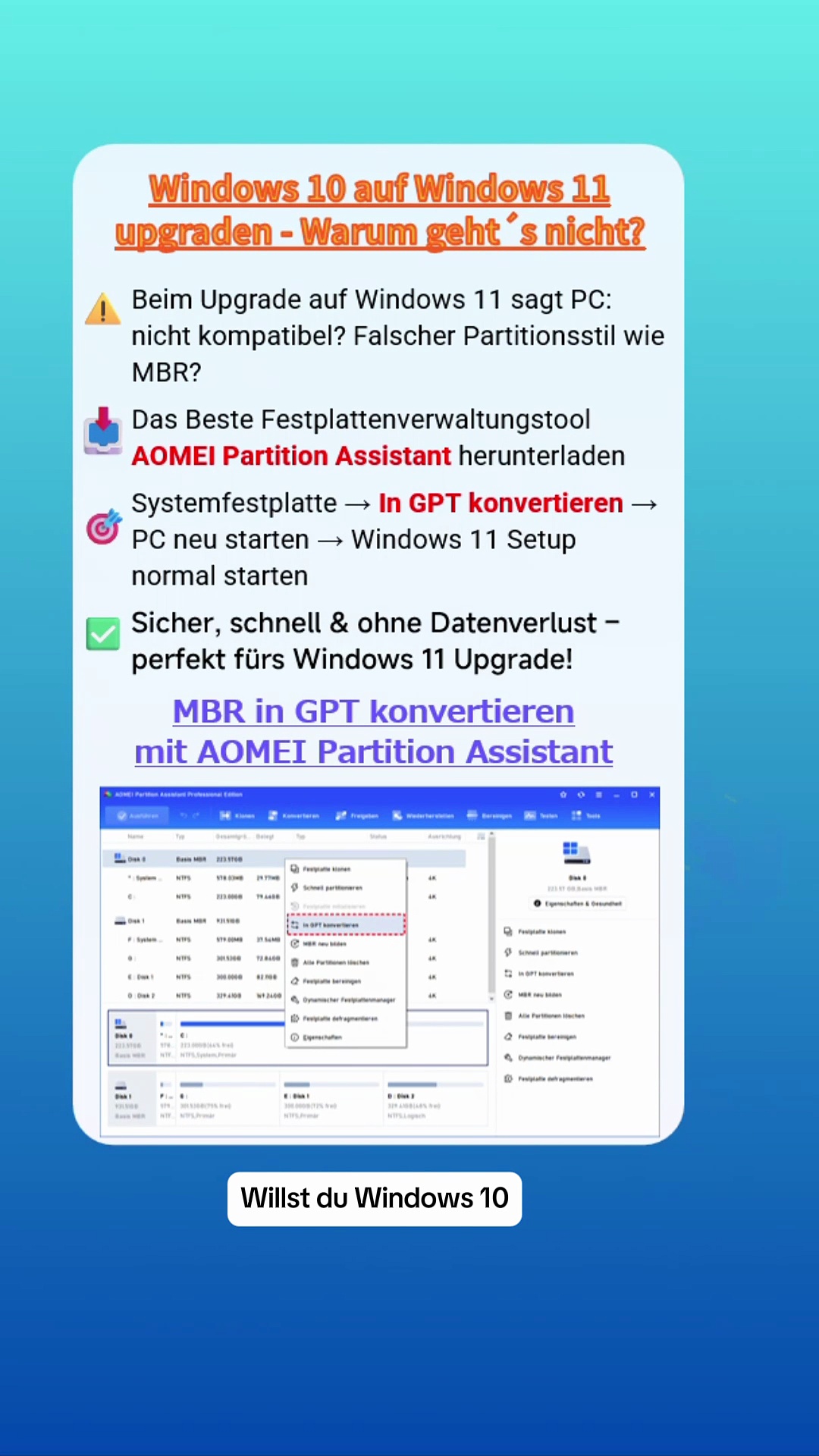 Dein PC will kein Windows 11, weil der Partitionsstil nicht passt?<br />❗ Fehlermeldung: „Dieses Gerät wird nicht unterstützt“ wegen MBR?<br />👉 Mit AOMEI Partition Assistant kannst du MBR einfach in GPT umwandeln – ohne Datenverlust & ohne Neuinstallation!<br />💻 Danach klappt das Upgrade von Windows 10 auf Windows 11 sogar auf älteren Computern.<br /><br />✅ Schnell<br />✅ Sicher<br />✅ Kein Neuaufsetzen nötig<br /><br />📥 Jetzt testen und loslegen!<br /><br />#Windows11Upgrade #MBRzuGPT #Windows10 #UpgradeFehler #Partitionsstil #TechTipps #PCUpgrade #WindowsTricks