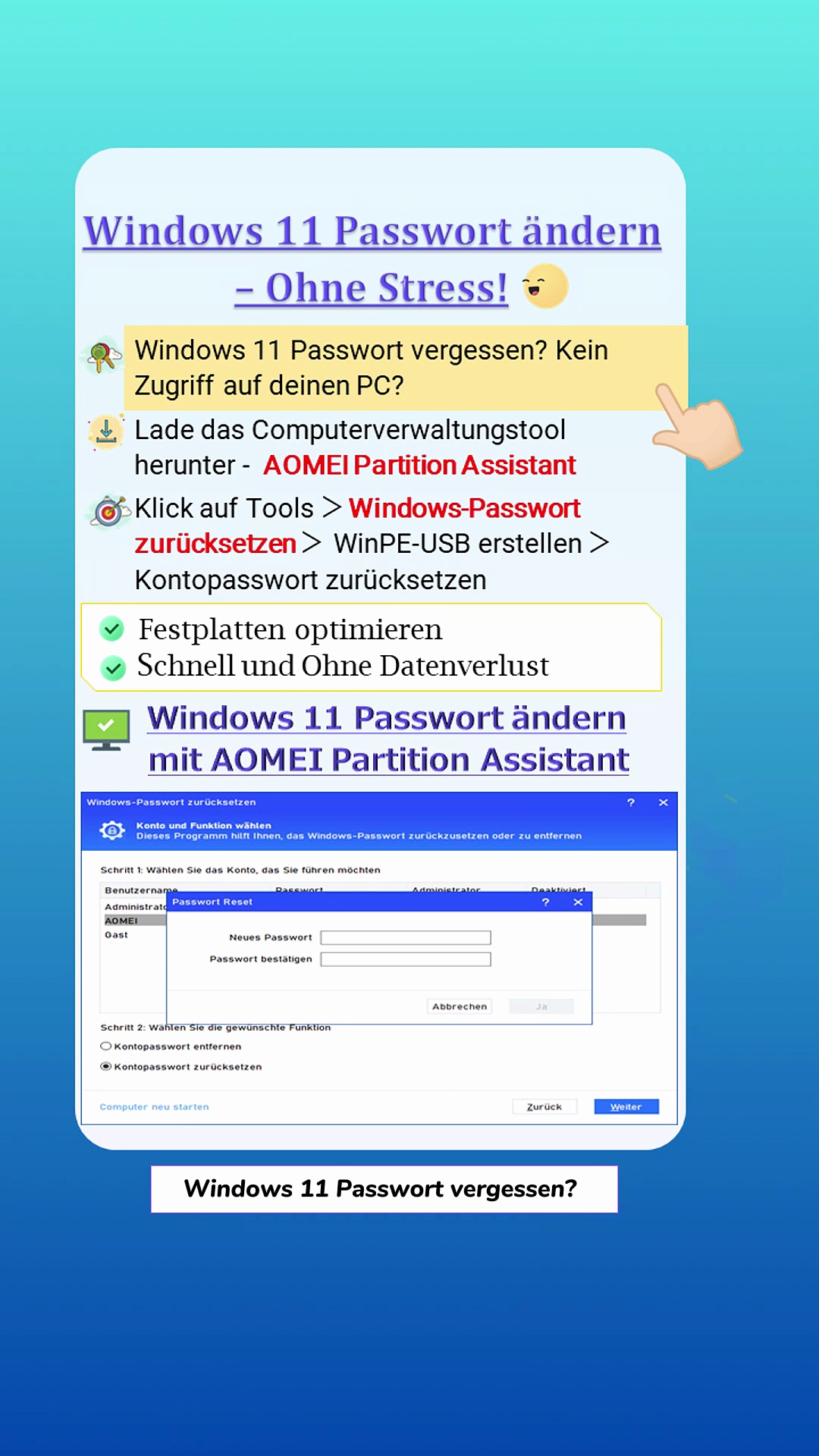 🔑 Windows 11 Passwort ändern leicht gemacht!<br />Egal ob Sie Ihr aktuelles Passwort vergessen haben oder es einfach aus Sicherheitsgründen ändern wollen – mit AOMEI Partition Assistant Professional geht es schnell und unkompliziert.<br />✨ Vorteile:<br />Funktioniert auch, wenn Sie Ihr Passwort vergessen haben<br />Keine Neuinstallation von Windows nötig<br />Einfach & sicher<br />⚡ Tipp: Ändern Sie Ihr Windows 11 Passwort regelmäßig, um Ihre Daten optimal zu schützen!<br />👍 Hat Ihnen dieser Tipp geholfen? Dann liken Sie das Video und schreiben Sie in die Kommentare, welches PC-Problem wir als Nächstes lösen sollen!<br /><br />#windows11 #windows11passwortändern #passwortändern #windows11tipps #pcpasswort #windows #pcsecurity #passwortvergessen #passwortzurücksetzen #aomeipartitionassistant #pctricks #windows11hilfe #passwortreset #ithelp #techhilfe #pcproblemlösung