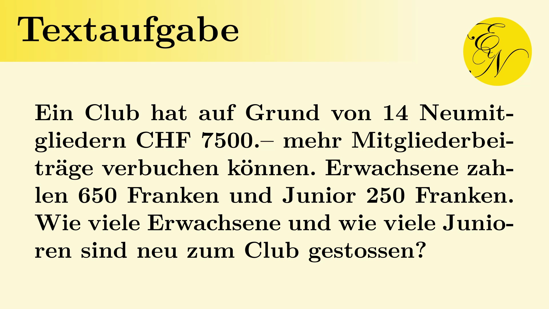 Gleichungssystem Textaufgabe Mitgliederzahl<br /><br />Willkommen auf dem Kanal von EducaNova. Hier findet ihr viele Lernvideos zu Themen aus der Mathematik und der Physik auf der Sekundarstufe 2.
