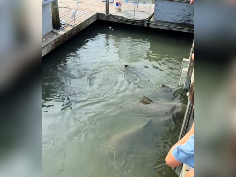 Ein seltenes Bild: Haie und ein Alligator schwimmen friedlich Seite an Seite durchs Wasser.