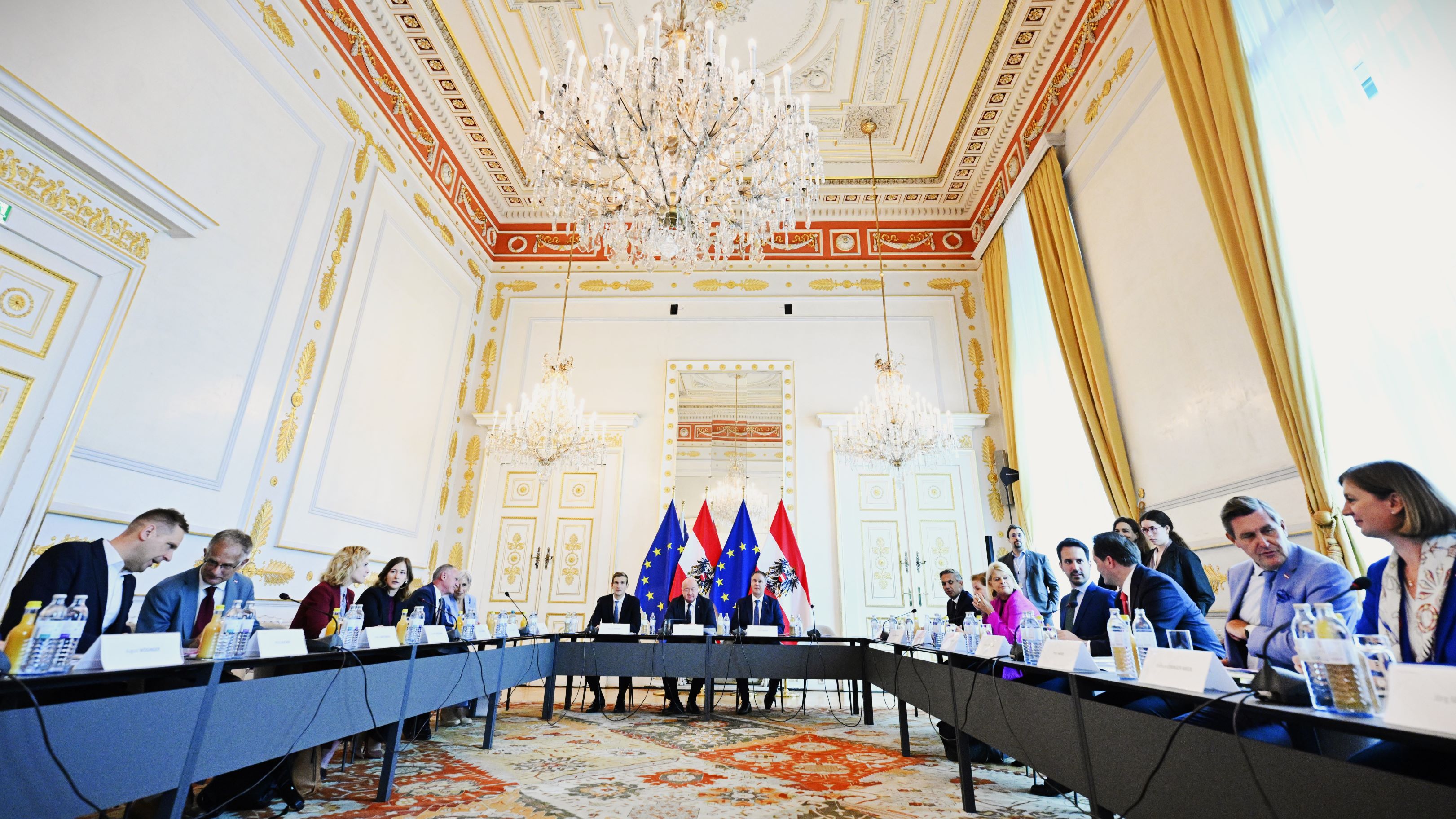Die schwarz-rot-pinke Dreierkoalition ist am Dienstag zu einer zweitägigen Regierungsklausur im Bundeskanzleramt zusammengekommen. Hauptthemen dabei sind die trübe Wirtschaftslage und die hohe Teuerung, wie die Parteispitzen von ÖVP, SPÖ und NEOS zum Beginn des Treffens erklärten. Zur Konjunkturbelebung soll ein Konjunkturpaket im Volumen von einer Milliarde Euro geschnürt werden.<br /><br />Credits: APA/bes; Thumbnail: APA/Hans Klaus Techt<br /><br />Mehr zum Thema und die neuesten Updates auf https://www.derstandard.at.