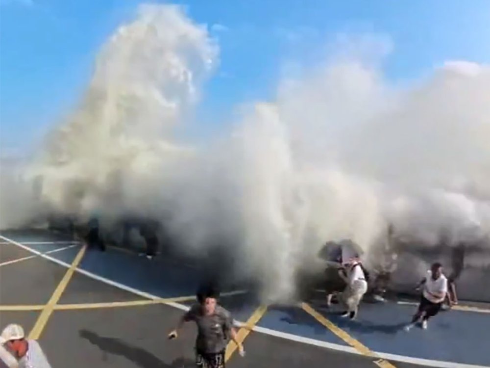 Eine riesige Welle überflutet eine Brücke in China. Das "Silberner Drache" genannte Spektakel lockt jährlich hunderttausende Touristen an.